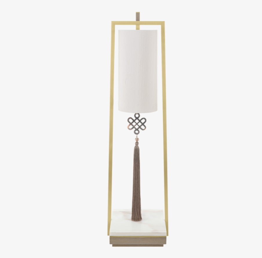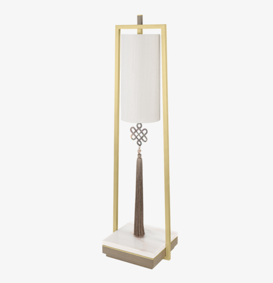The globally inspired CHIANG MAI Table Lamp features a cylindrical shade woven from double silk and an ornamental tassel. These are suspended within an angular frame of brushed brass weighted by a base of stone and wood veneer.