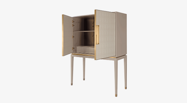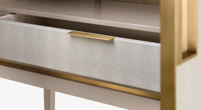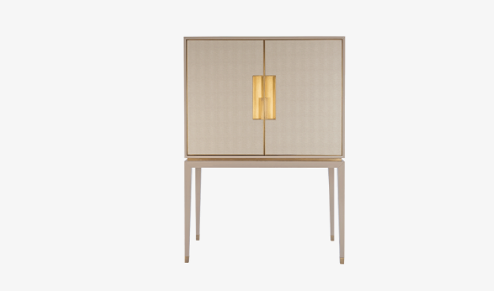 An unexpected use of rarefied materials imbues the ALPINE tall cabinet with a quiet luxury. Note the leather-covered door fronts, brushed-brass handles and trim, mirrored interior back and suede-lined drawer. Storage never looked so suave.