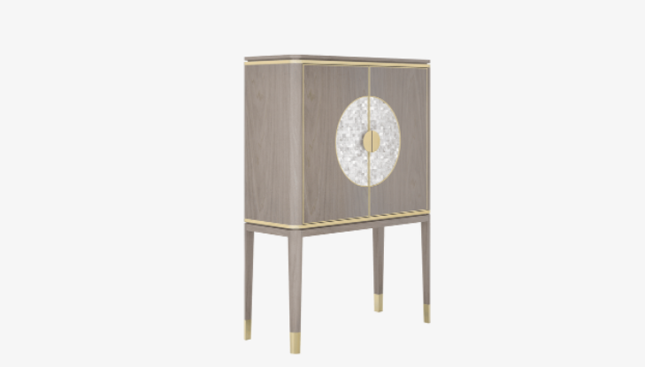 The striking SEVILLE tall cabinet uses elegant materials to elevate a pared-back silhouette. Crafted from glossy wood veneer, details of brushed brass and a circular inlay of white mother-of-pearl catch the light and the eye.