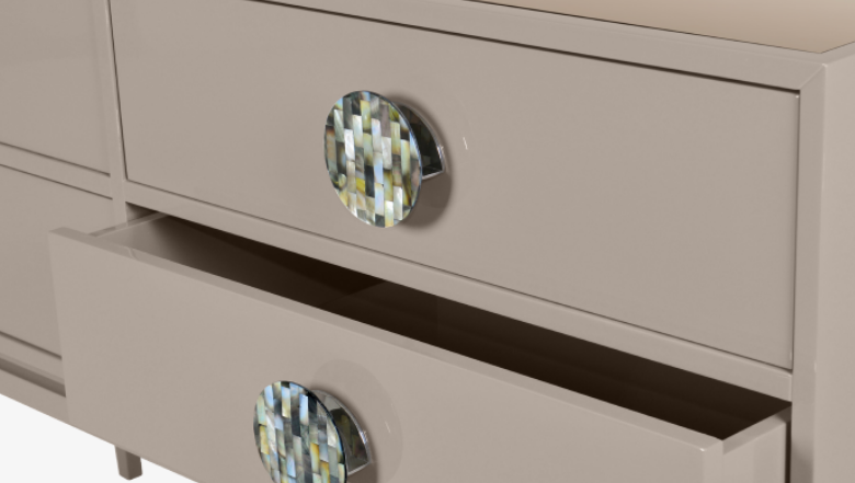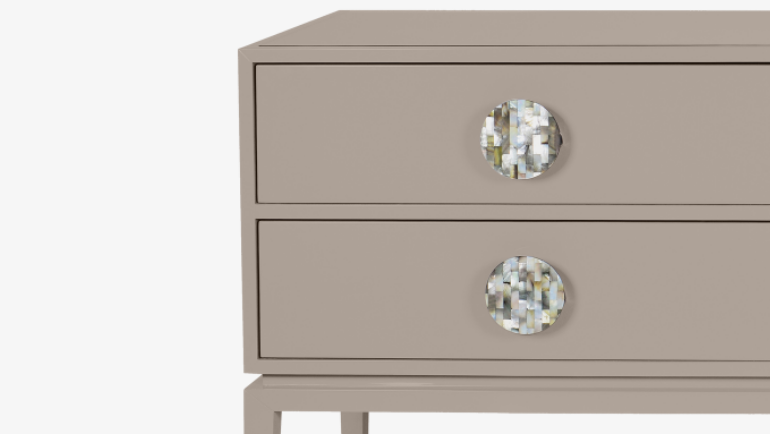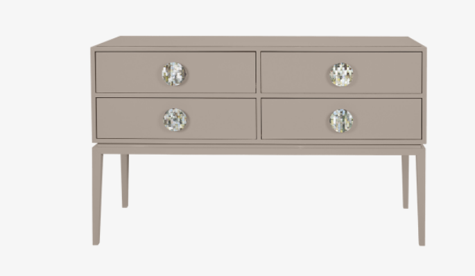 Elevate your beauty routine with the four-drawer GEORGIA dresser, which puts a fresh spin on a classic silhouette with contemporary materials including a glossy lacquer structure and bronze mirror surface inlay. Black mother-of-pearl handles add the finishing touch.