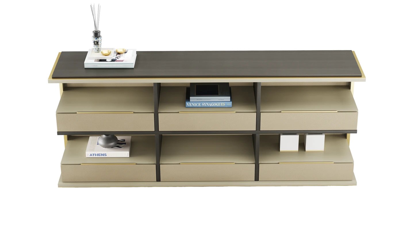 Our MARFA Sideboard perfects the balance between simple and statement. It's crafted from premium satin open pore wood and features leather and brass highlights. The box drawers give optimal space for both storage and display.