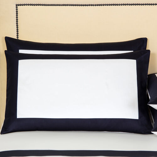 The Bold Pillowcase features soft, long-staple cotton sateen and a striking contrast border finished with a sleek simple stitch.