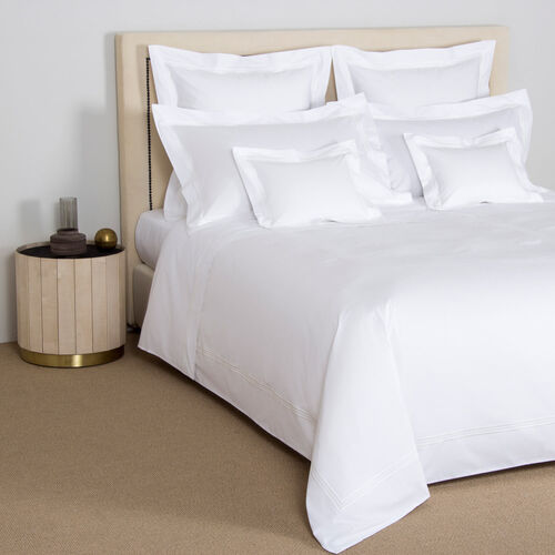 The Triplo Bourdon Sheet Set is crafted from smooth cotton poplin and has a remarkable sheen and brightness and finished with a three-line embroidery. This sheet set includes a top sheet, a fitted bottom sheet, and two shams. 100% cotton. Made in Italy.
