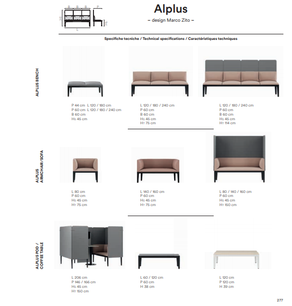 Alle tradizionali postazioni di lavoro, la flessibilità di panche, poltrone e divani Alplus crea una proposta di arredo unica ed omogenea.