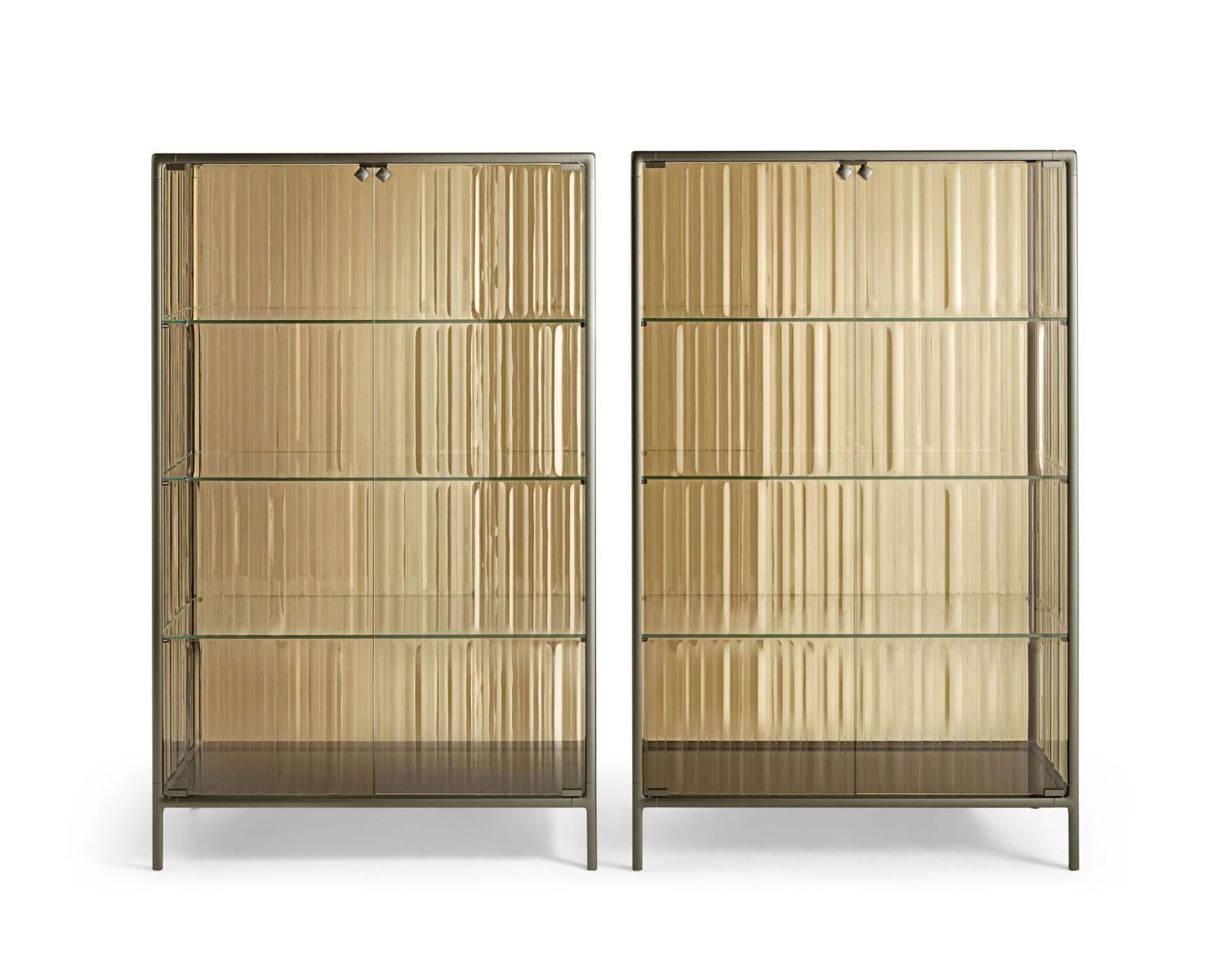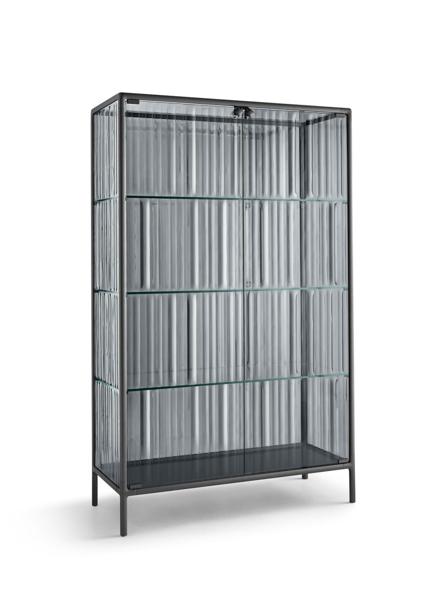 Vetrina con struttura in alluminio verniciato, disponibile nelle finiture Champagne Metallizzato, Greige Metallizzato e Grigio Vulcano.