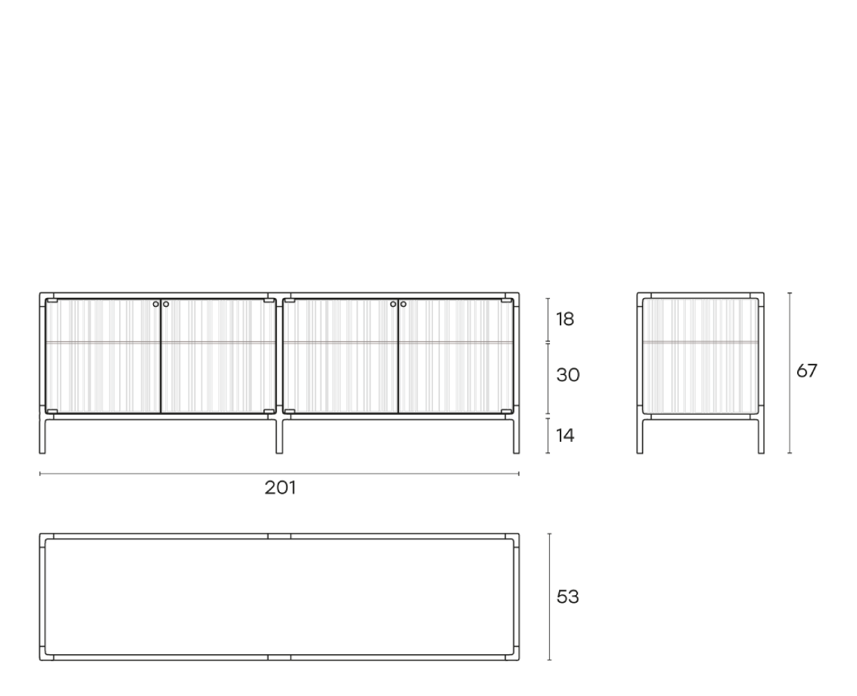Base in vetro extralight da 6 mm temperato retroverniciato in tinta con la struttura; corpo vetrina ed ante in vetro extralight, fumé o bronzo da 6 mm fuso a gran fuoco e temperato; ripiani in vetro extralight da 8 mm temperato.
