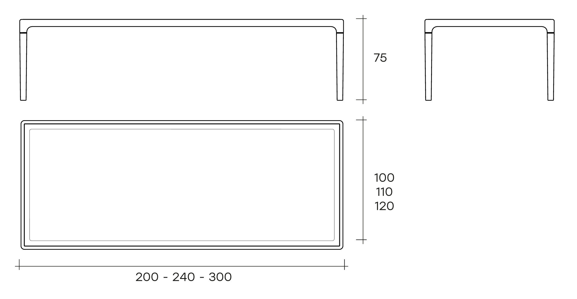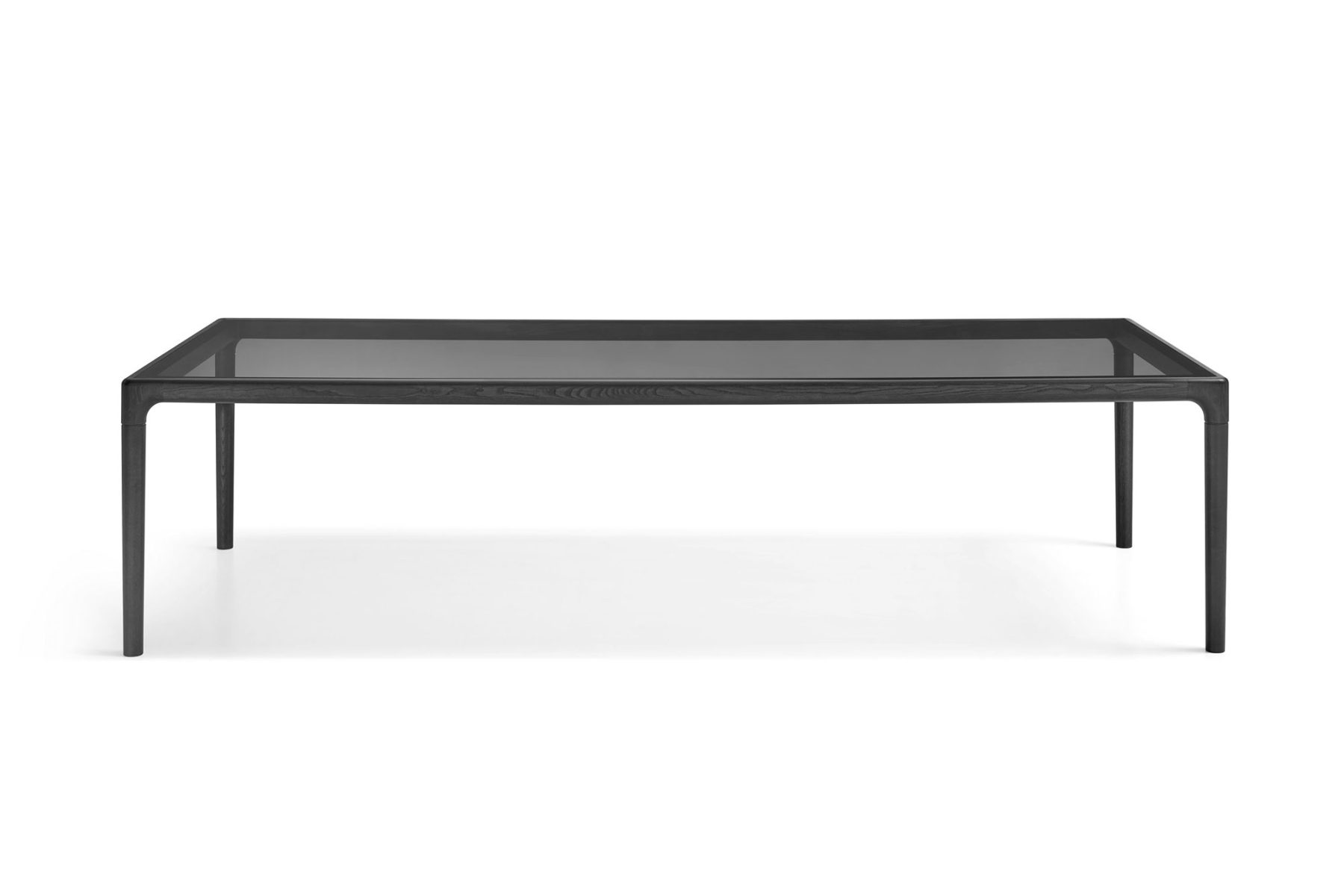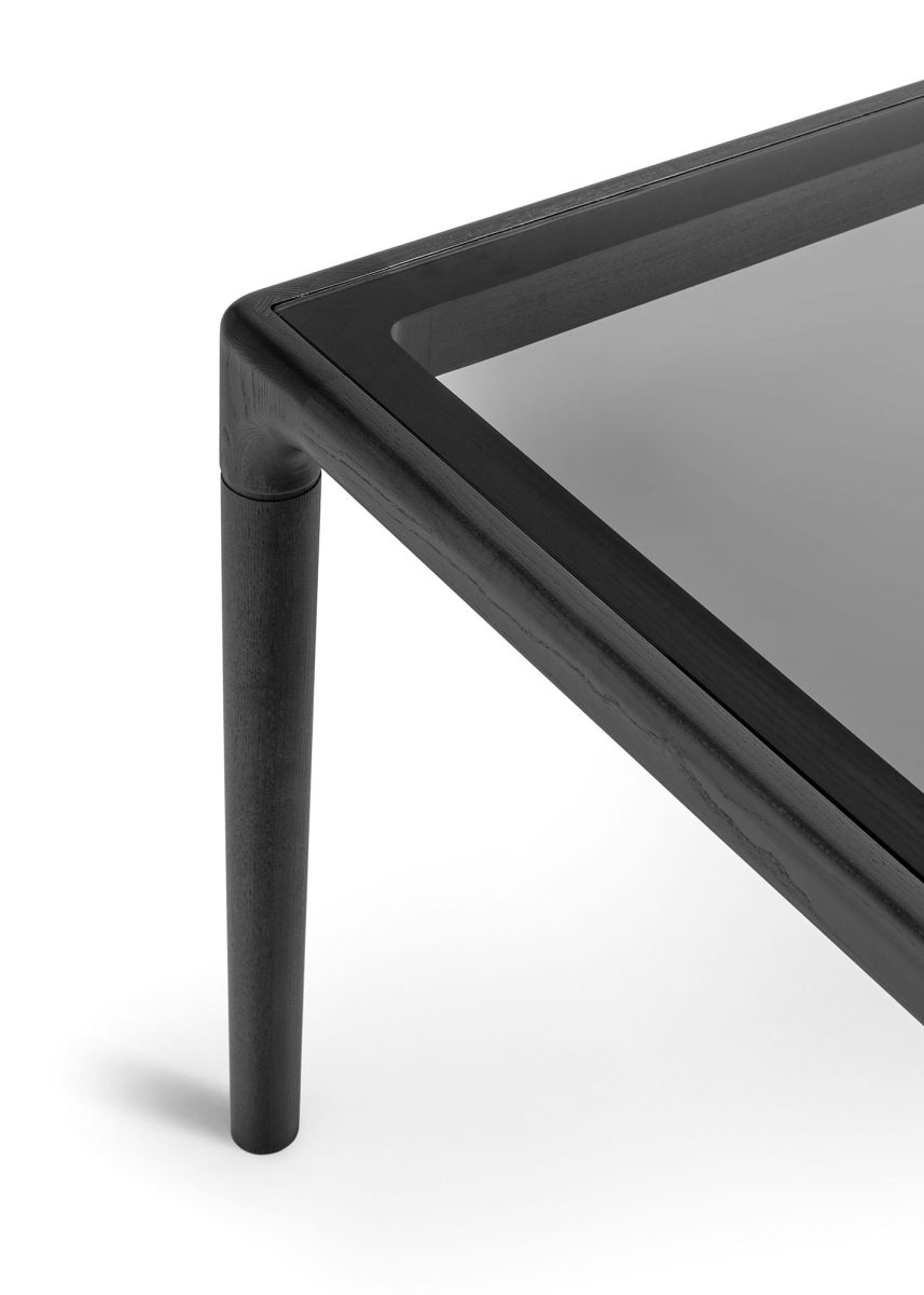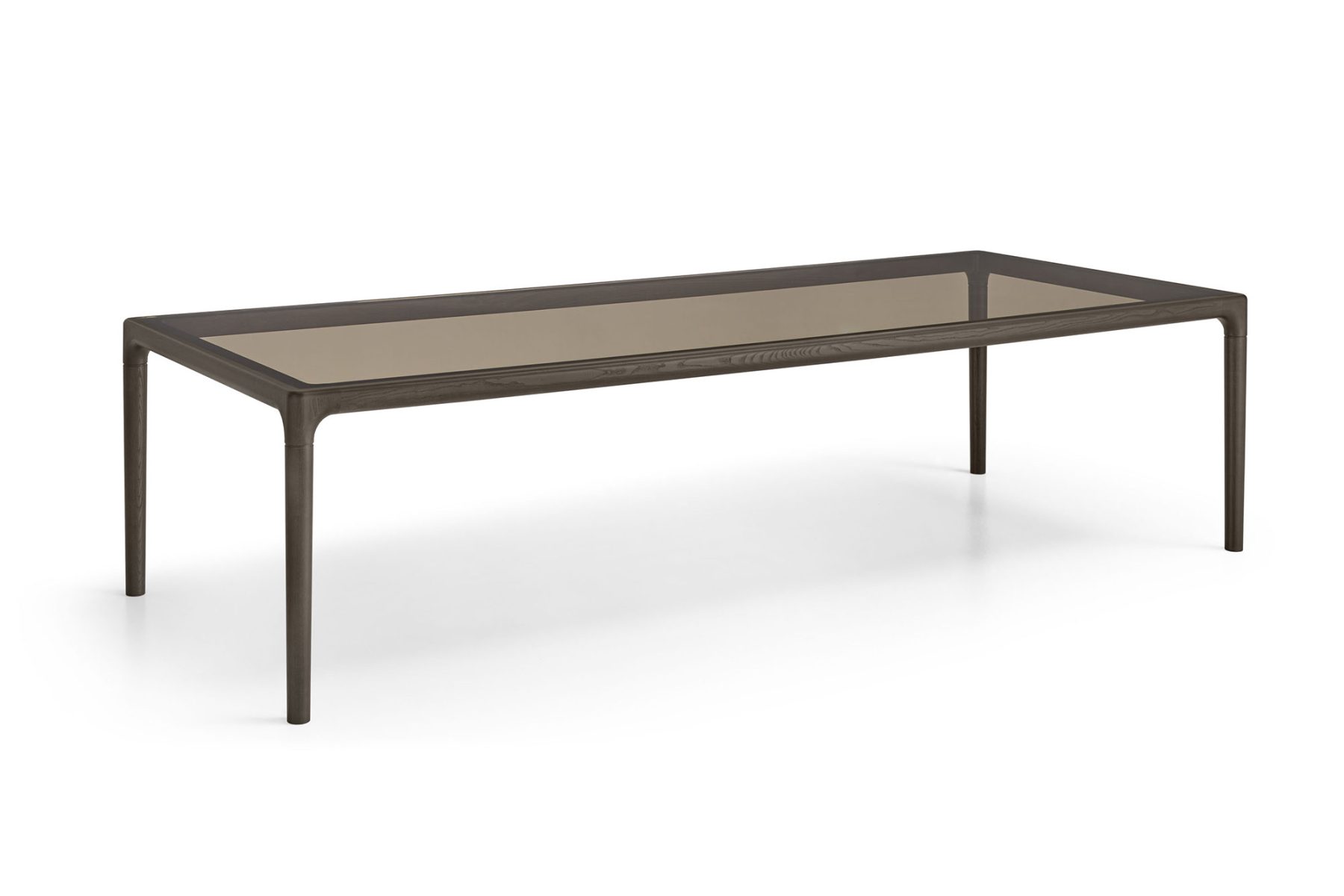 Tavolo con piano in vetro da 8 mm temperato, struttura in legno massello disponibile nelle finiture Tabacco o Termotrattato Nero.