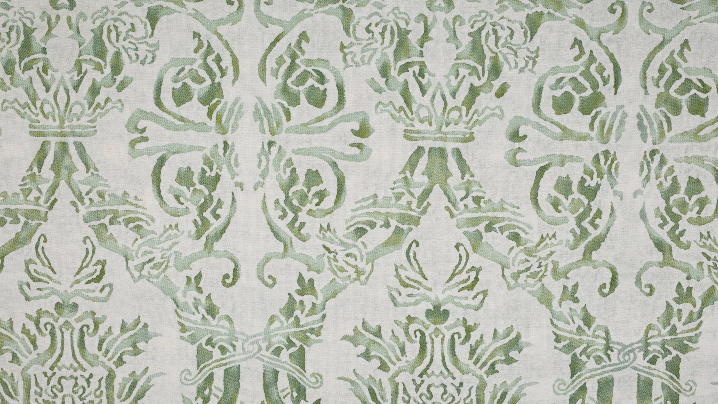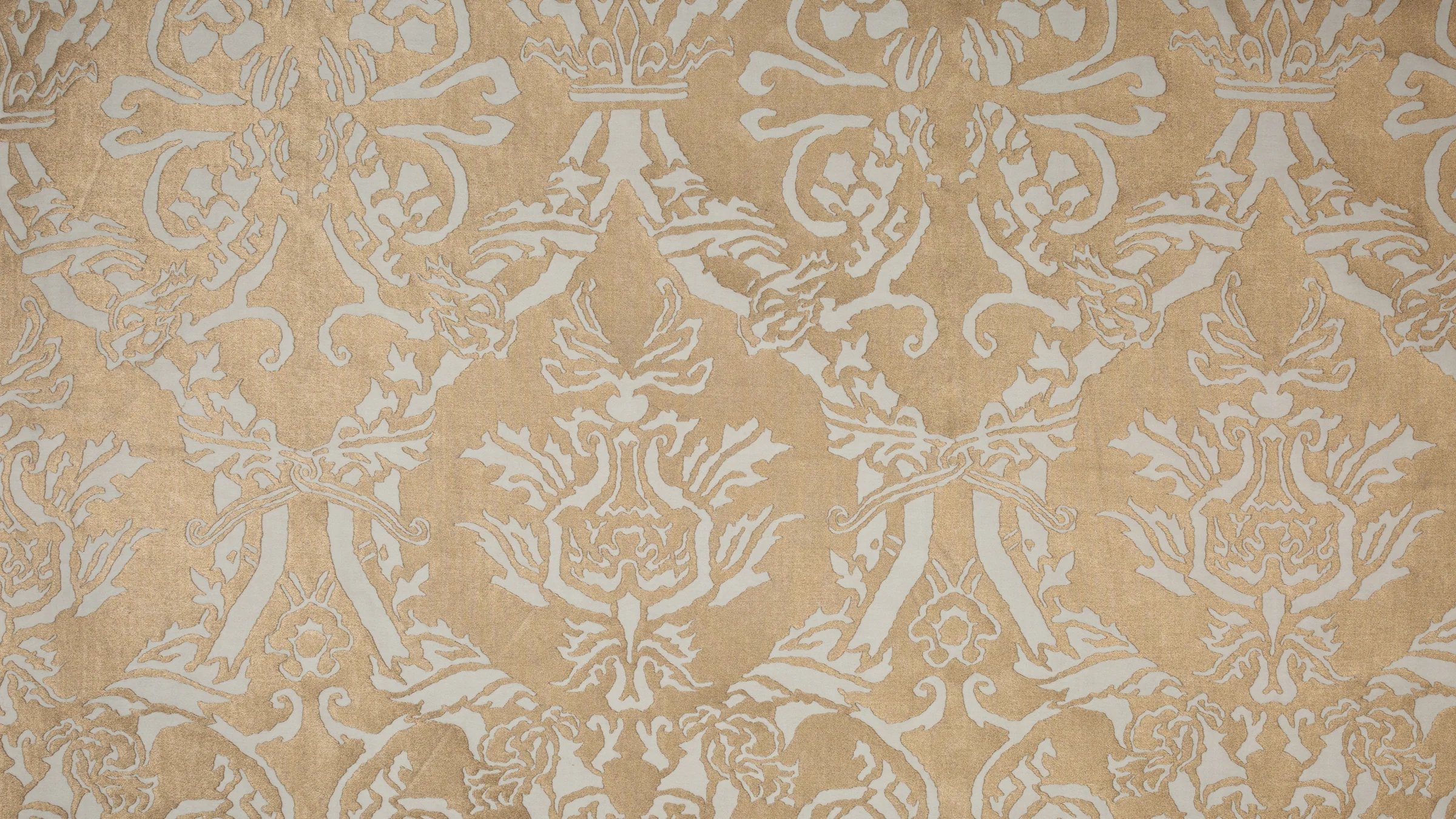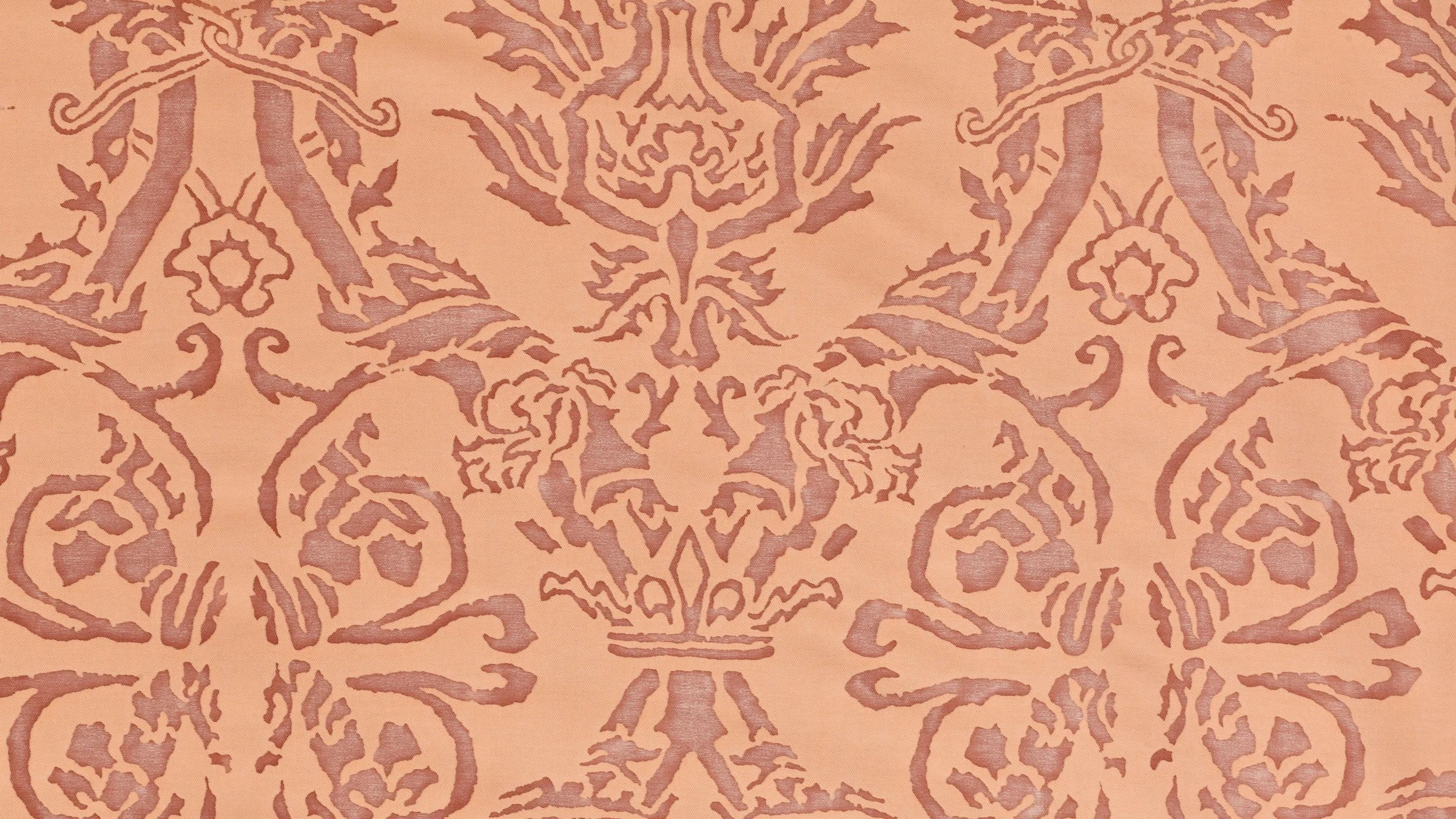 Like an intricately designed gate, SPAGNOLO winds across the field, tangled in vines and leafy tendrils while supporting a lush, seemingly mid-bloom pomegranate motif. The 17th-century Spanish design, created early in Mariano Fortuny’s career, pays tribute to his motherland and the city of his birth, Granada, Spanish for pomegranate.