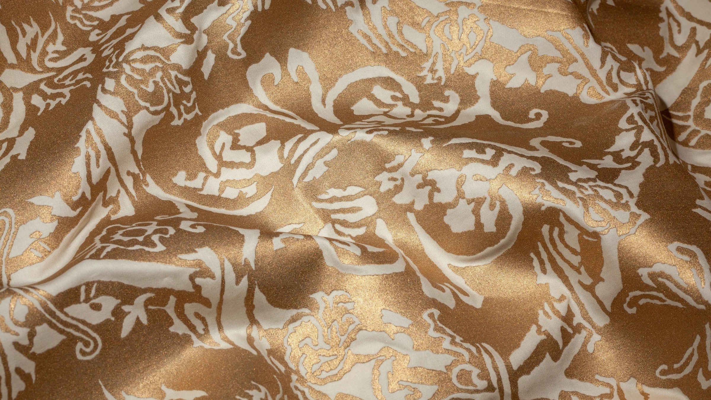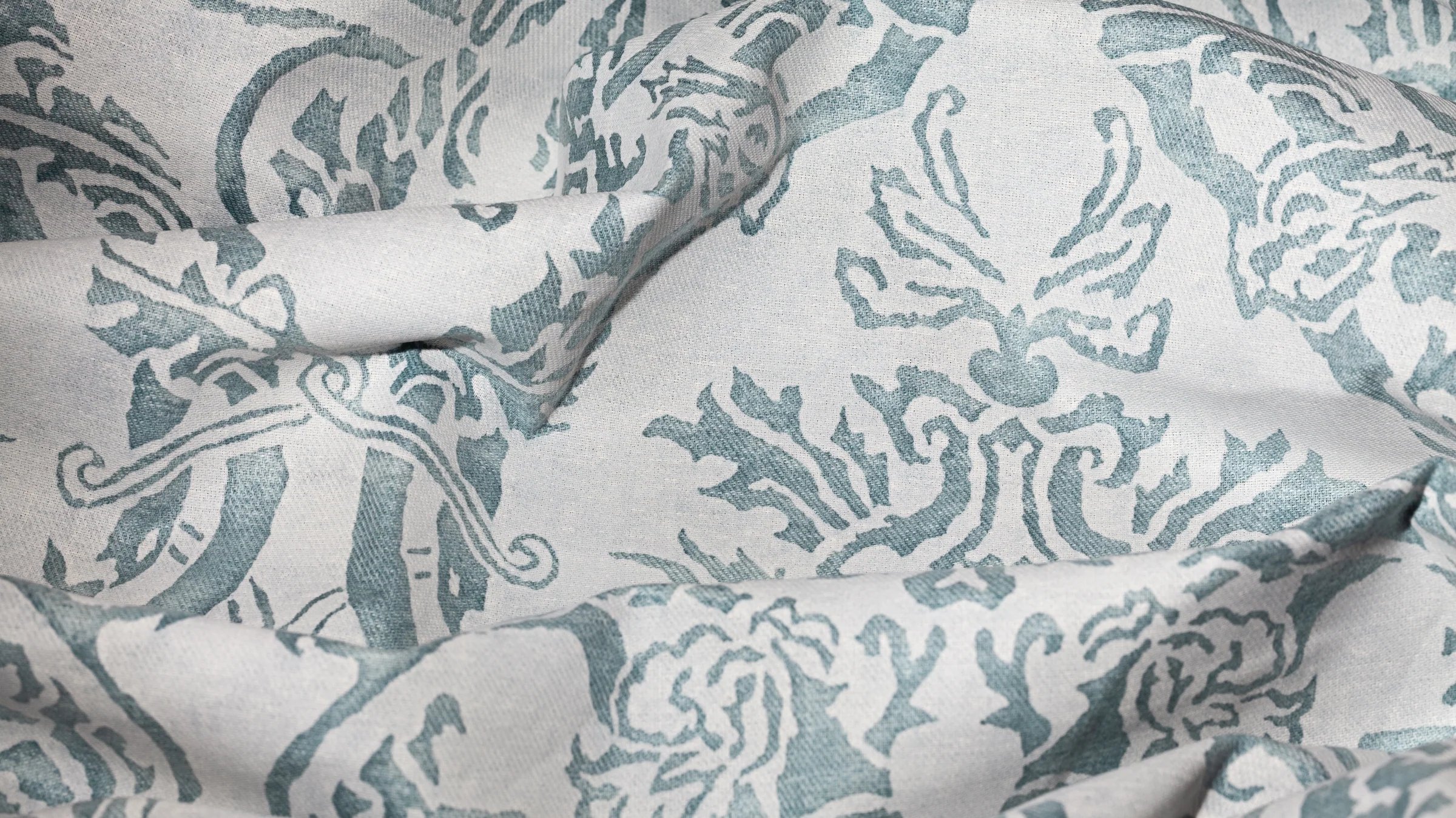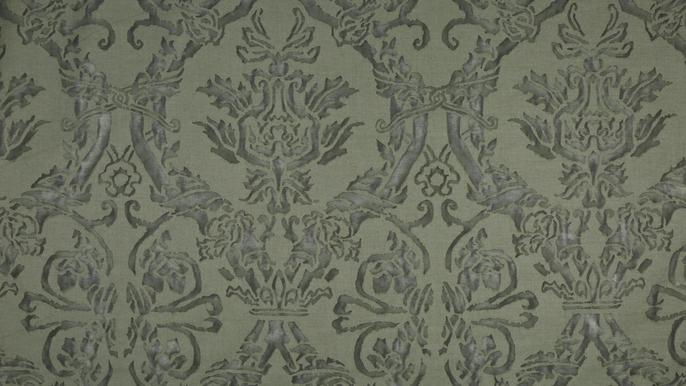 Like an intricately designed gate, SPAGNOLO winds across the field, tangled in vines and leafy tendrils while supporting a lush, seemingly mid-bloom pomegranate motif. The 17th-century Spanish design, created early in Mariano Fortuny’s career, pays tribute to his motherland and the city of his birth, Granada, Spanish for pomegranate.