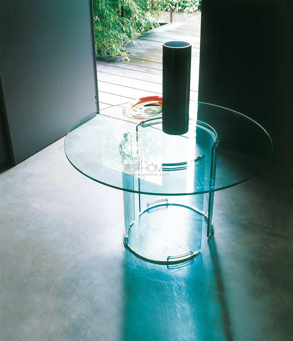 Table in transparent glass. Bases in 15mm thick glass curved by fire and hand bevelled. Chromed brass clips. Available also without metal parts (total height: 72cm). Customized sizes for the top on request. For glass top larger than 260cm, four bases are recommended.