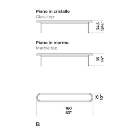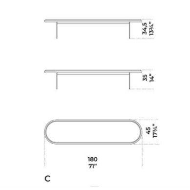 In appoggio sul top in legno, piano in cristallo 12mm molato a mezzo toro nella finitura esclusiva “Rosso Marte”. Disponibile anche piano in marmo 20mm Calacatta Vagli Oro lucido naturale oppure Ceppo di Gré spazzolato. Il tavolino “A” viene realizzato esclusivamente con piano in legno ribassato.