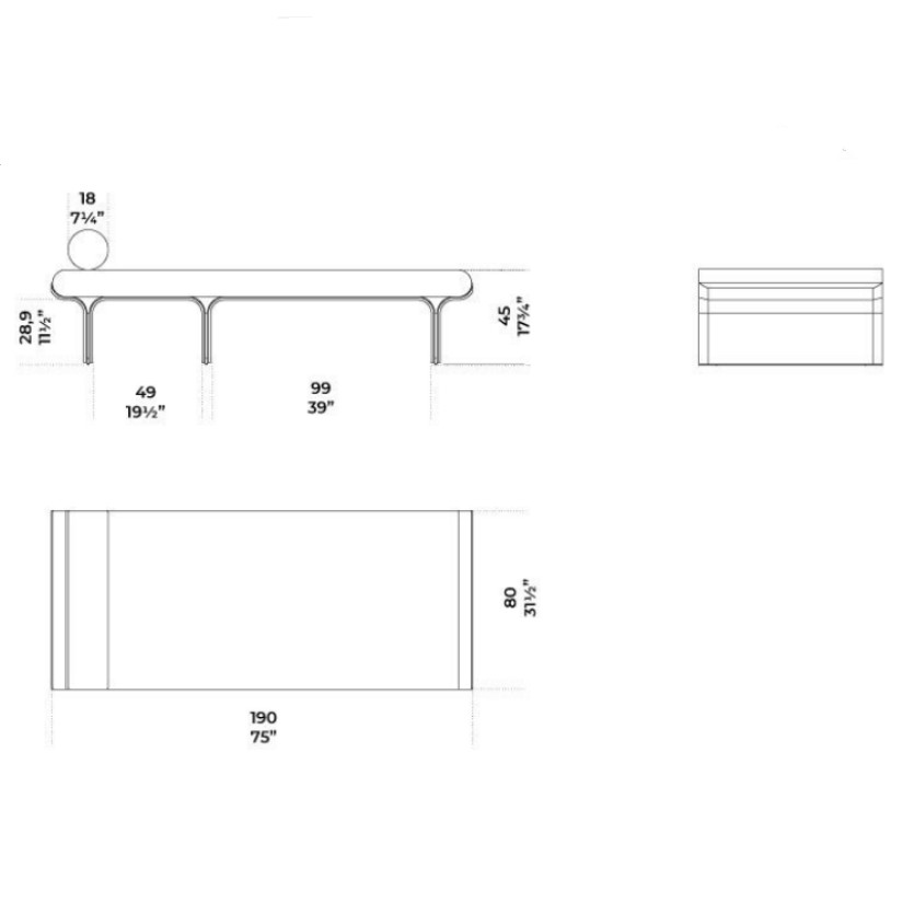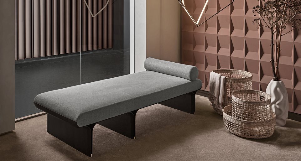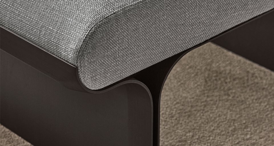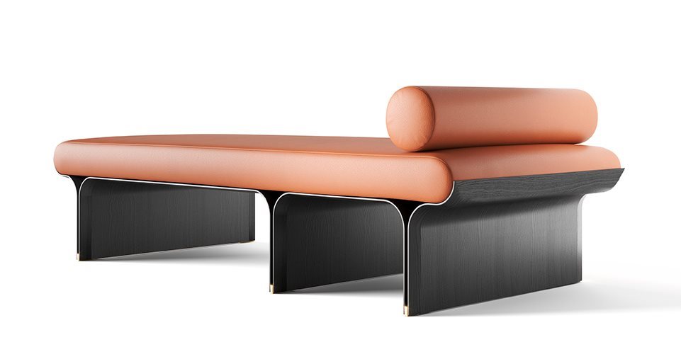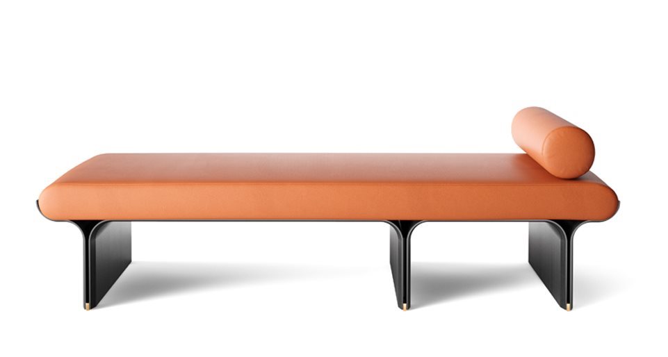 Day bed con base in frassino curvato tinto nero poro aperto e dettagli in ottone lucido. Cuscino in poliuretano espanso rivestito in tessuto o pelle nei colori del campionario. Il prodotto include un poggiatesta cilindrico zavorrato. Rivestimento sfoderabile.