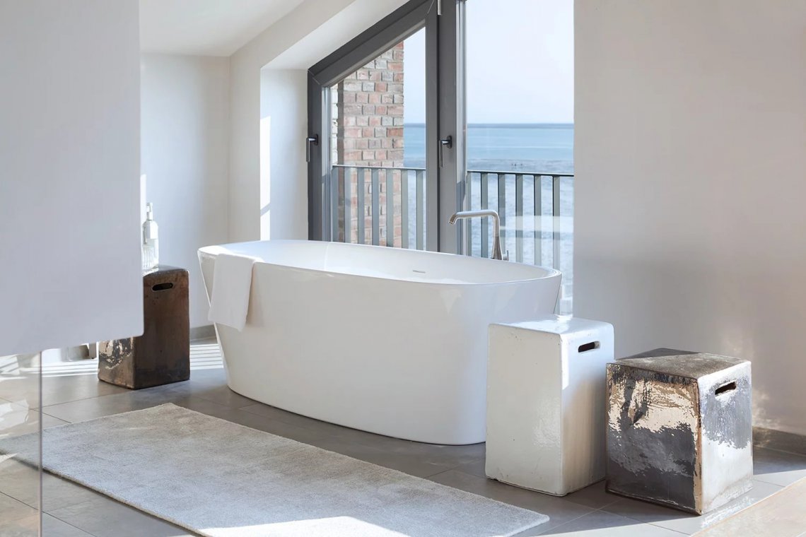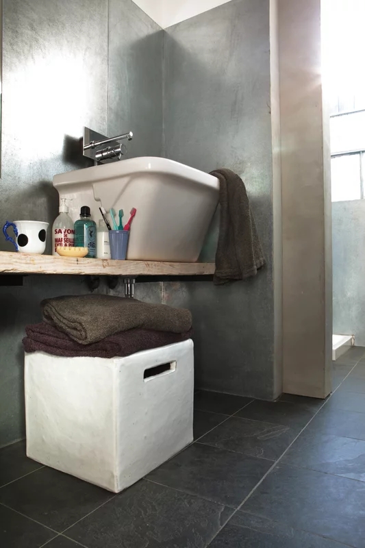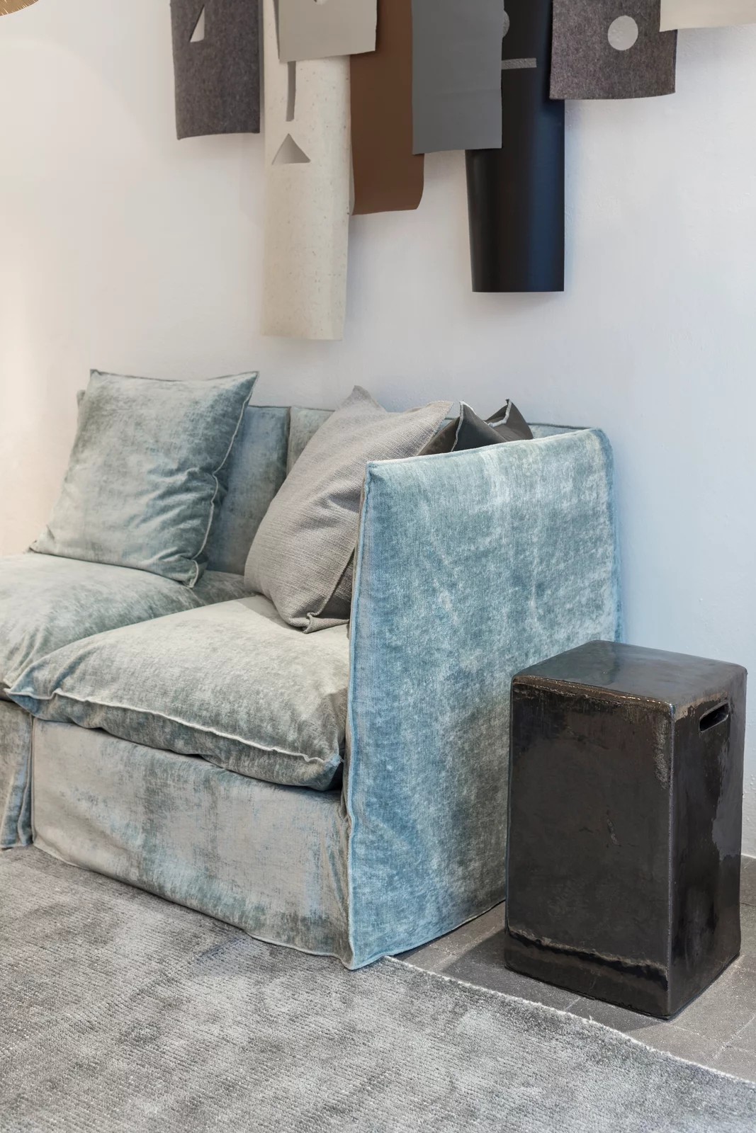 Famiglia di tavolini-pouf in cemento GFRC blu, bianco o grigio antracite, Inout 41/42/43 si distinguono per la loro essenzialità: semplici forme cubiche o a parallelepipedo, per dare vita a prodotti di sofisticata essenzialità.