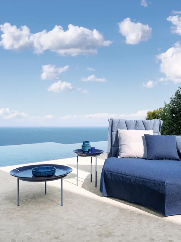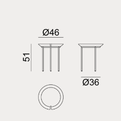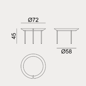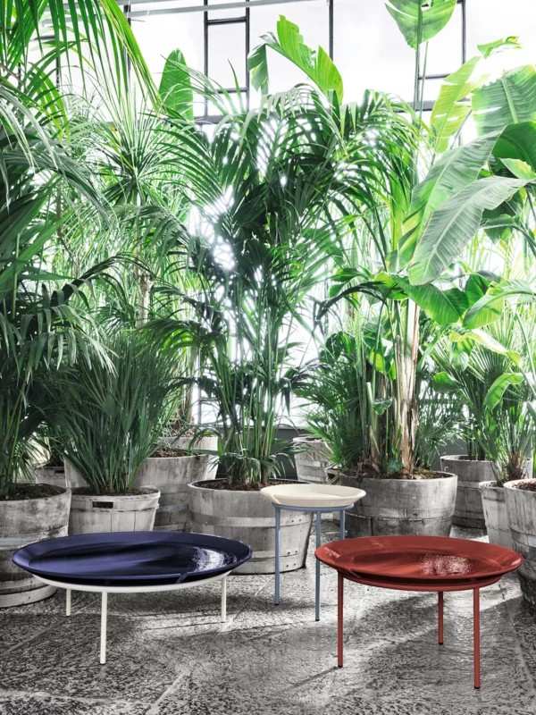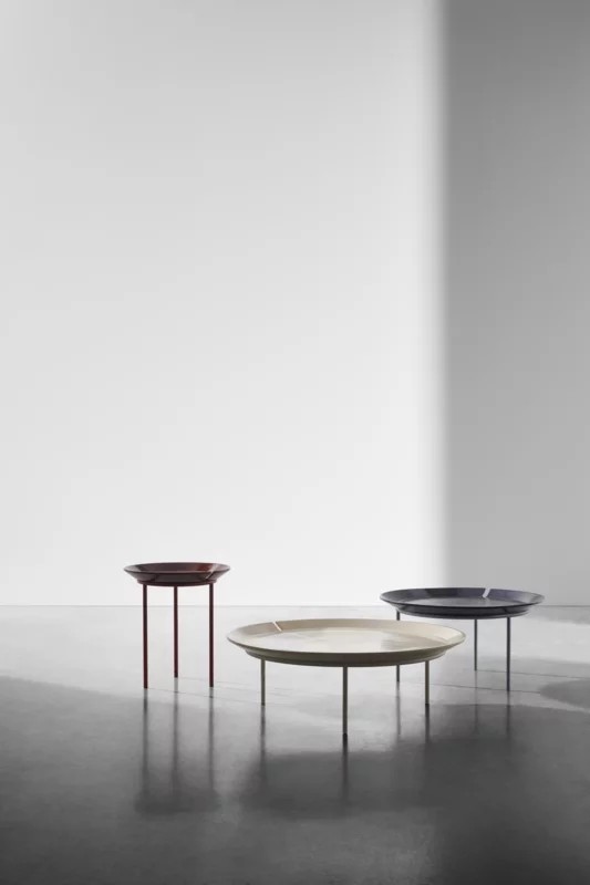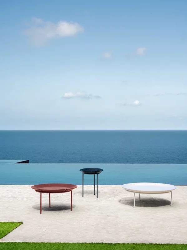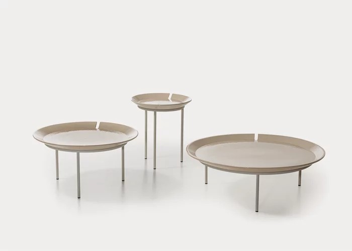 La collezione è composta da tavolini tondi con base in acciaio inossidabile in tre colori: bianco, rosso e grigio. Top amovibile in Millgres disponibili in diverse dimensioni e altezze e in una palette di colori dinamica, in cui al rosso e al panna si aggiunge anche il blu.