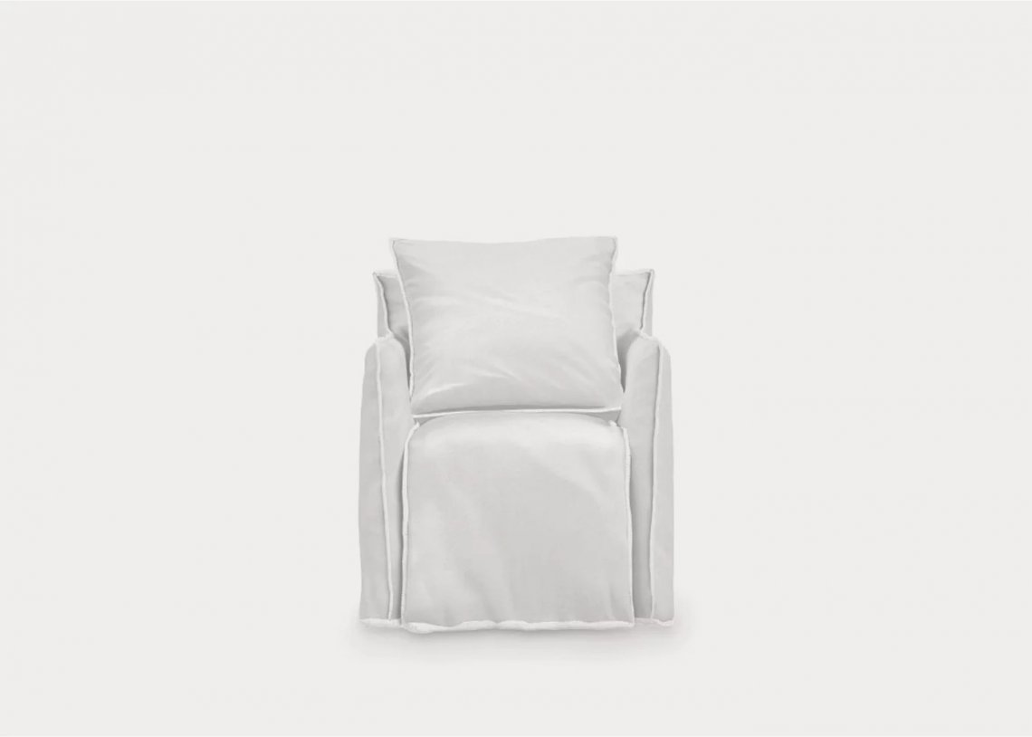 La poltrona Ghost out imbottita e sfoderabile è una seduta comoda ed avvolgente che si sviluppa attorno ad una leggera scocca dai volumi essenziali. Ideata per resistere all’acqua e alla luce solare e per mantenere nel tempo la sua forma e la sua estetica, è caratterizzata da una struttura geometrica in cui la morbidezza è accentuata da cuscini volanti. Caratteristica principale è il rivestimento: una housse oversize il cui profilo è sottolineato dalle cuciture a vista, per svestirsi con facilità e assumere un’immagine ogni volta diversa.