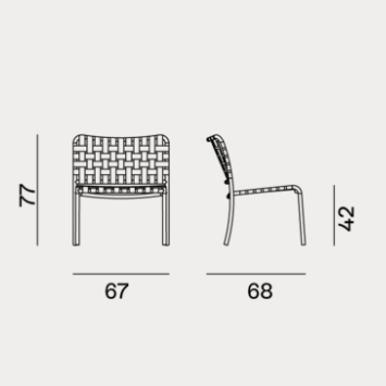 Inout 825 si sviluppa attorno ad una leggera struttura in tubolare di alluminio verniciato goffrato Pealr, Oxido, Agate o Slate, materiale ecologico ed unico per qualità tecniche. A questo si aggiunge un particolare intreccio in cinghia elastica grigia, nera, blu o tabacco, un prodotto innovativo a base di gomma sintetica e propilene.