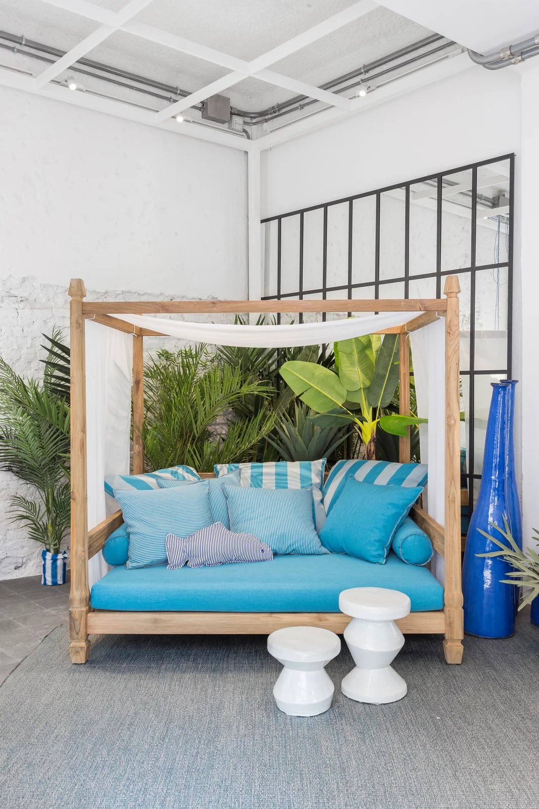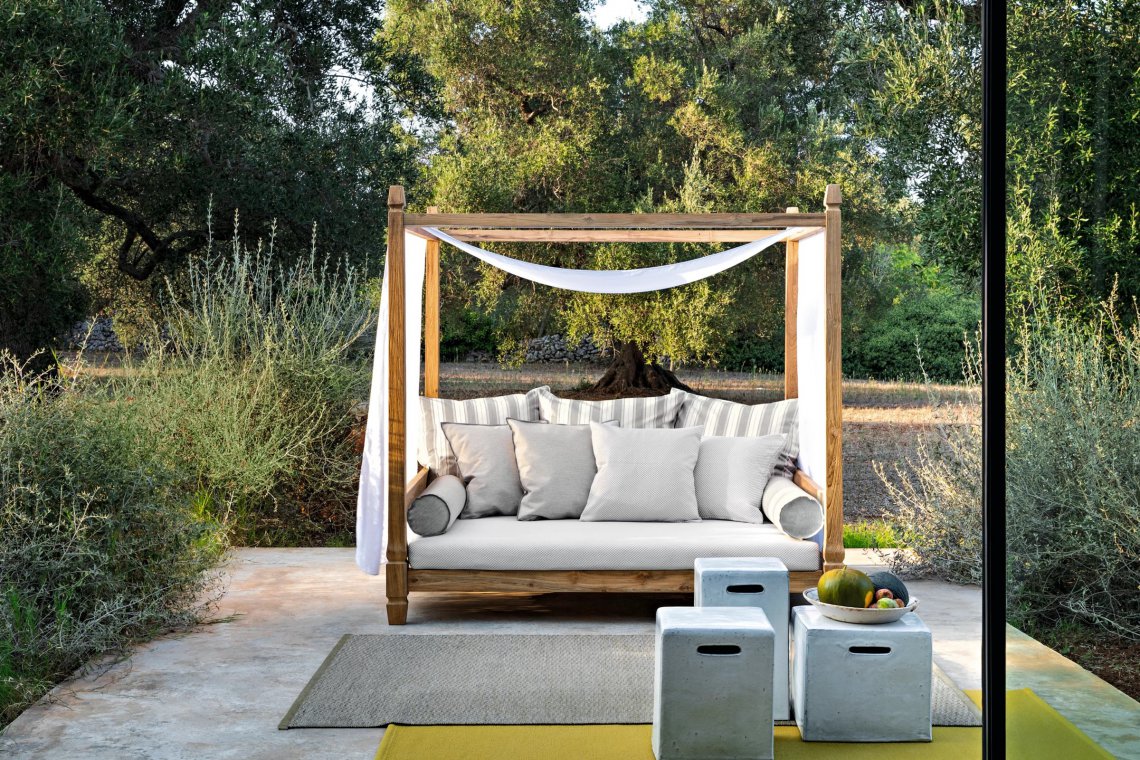 Divano a baldacchino in stile coloniale di ispirazione esotica, Jeko 07 ha una struttura realizzata in ECOTeak, materiale proveniente dal riutilizzo di travi ed elementi in teak recuperati, riparati con legno riciclato, assemblati e levigati per evidenziare le venature originali. è caratterizzato da una seduta ampia e bassa, con cuscino sfoderabile a cui si possono aggiungere cuscini volanti per aumentarne il comfort. Dai quattro angoli del divano partono 4 colonnine in legno che vanno a costruire il baldacchino, sul quale è adagiata una tenda bianca per una maggiore privacy ed intimità.