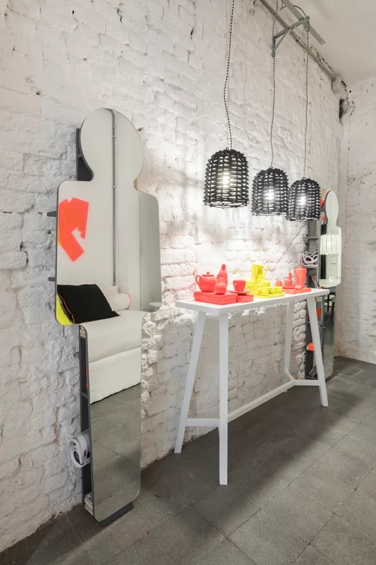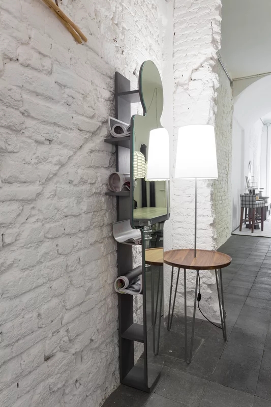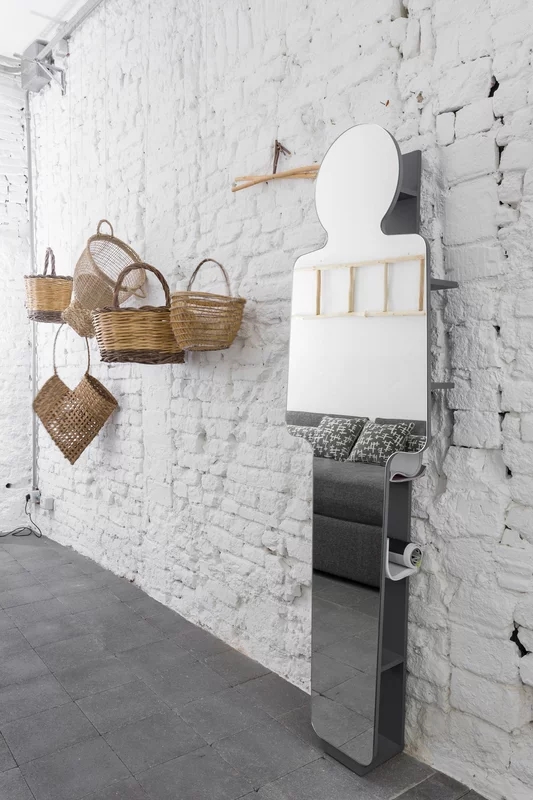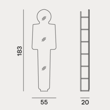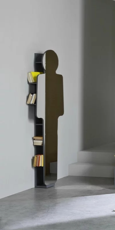 Specchio e mobile, LC 97 unisce due funzionalità diverse in un solo prodotto. Un progetto dal carattere forte in cui uno specchio a terra, che rappresenta una sagoma umana, integra e al tempo stessa cela un sistema a ripiani in noce canaletto naturale, nero, bianco o grigio, oceano o tortora. Disponibile anche senza sistema di ripiani (LC 197).