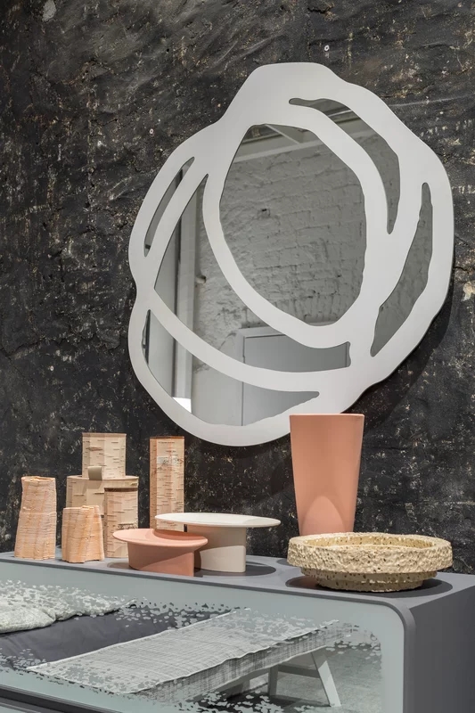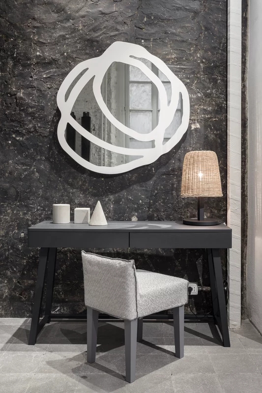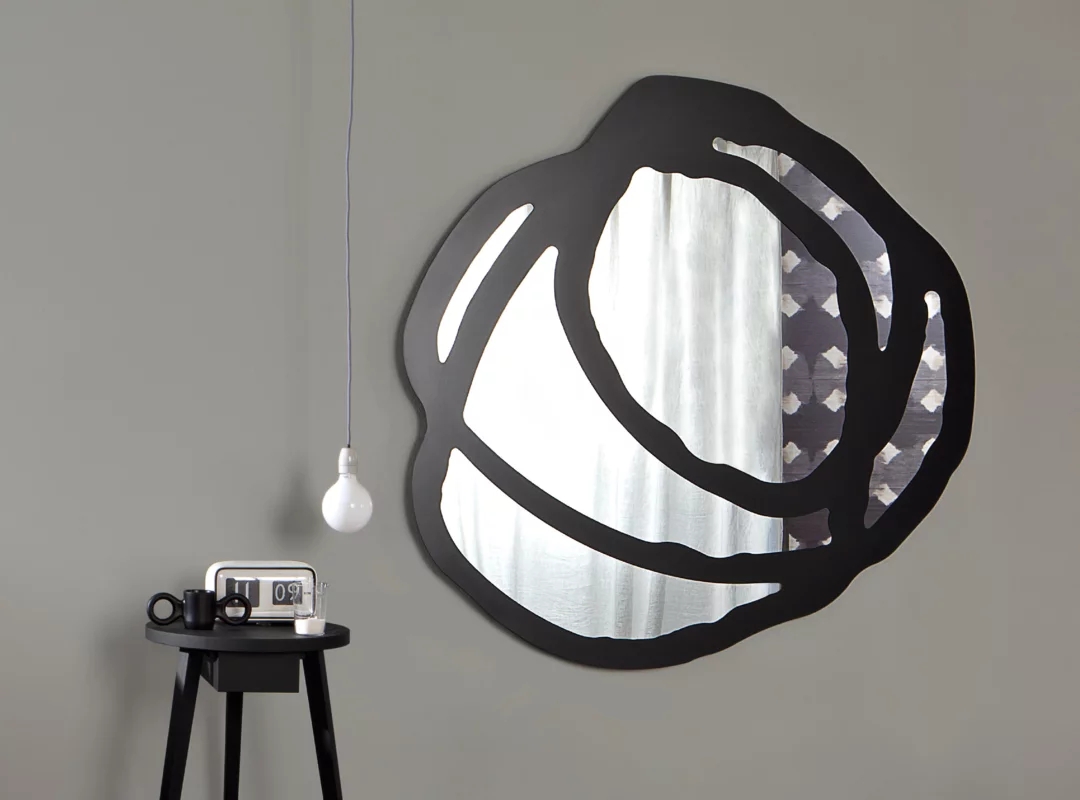 Famiglia di specchi a parete disponibili in due dimensioni, Sweet 97/98 sono caratterizzati da confini arrotondati ed irregolari. Si tratta di specchi con grande forza espressiva e decorativa grazie al motivo serigrafato nero o bianco che disegna sulla superficie cerchi e forme irregolari che si intersecano tra di loro, in un gioco di sovrapposizioni di linee.