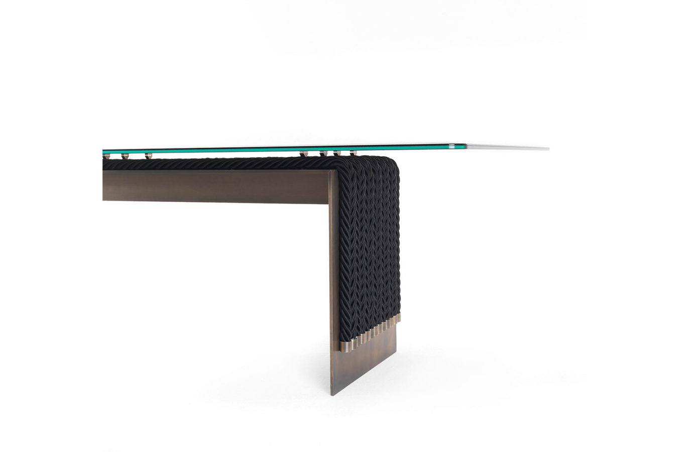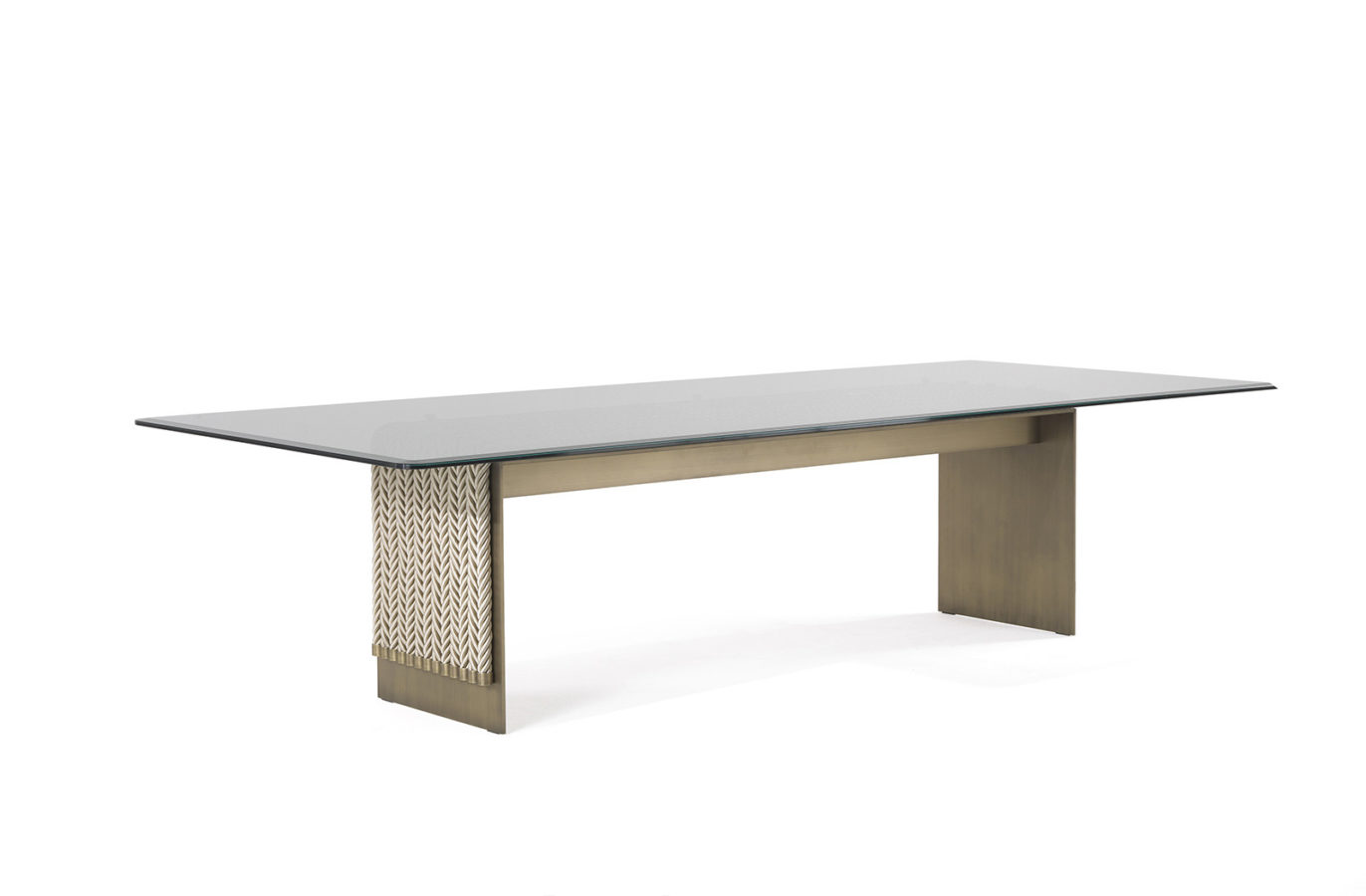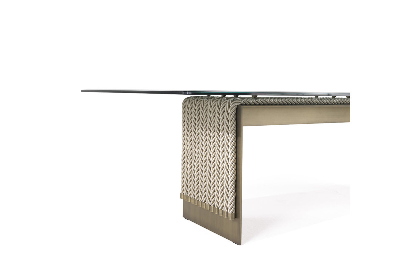 Rectangular dining table with structure in metal with bronzed finishing. Coupled glass top (extra clear + smoky) and decorative ropes. Details in bronzed finishing.