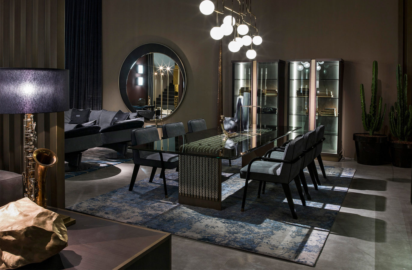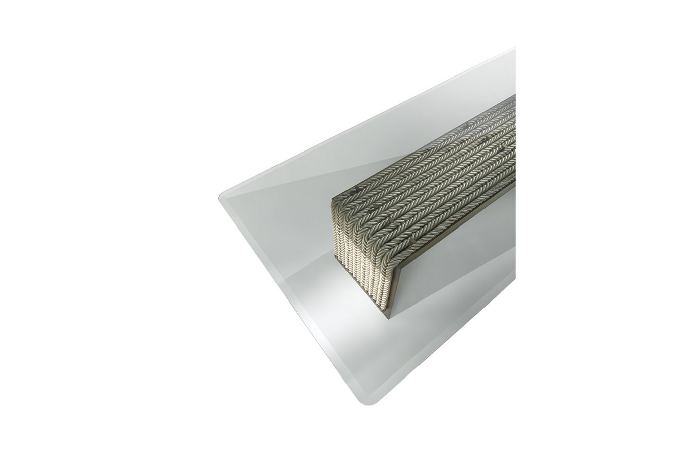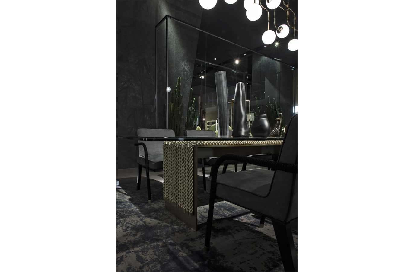 Rectangular dining table with structure in metal with bronzed finishing. Coupled glass top (extra clear + smoky) and decorative ropes. Details in bronzed finishing.