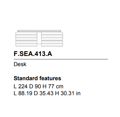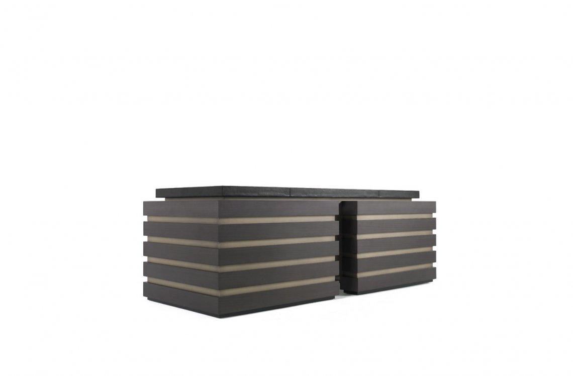 Elegant, functional and comfortable, the Sean desk plays the leading role in the office environment. Made in Tay wood tinted smoky grey, it features inserts with bronzed finish and a top upholstered in leather that lends the desk a feeling of comfort and softness.