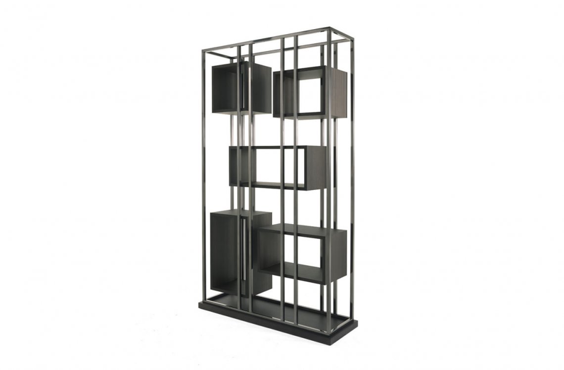 Geometries and chromatic games distinguish the iconic Mackintosh double-sided bookcase, a contemporary piece of furniture with decorative allure, worthy of a starring role in any living space. Proposed in a new version that combines the black chrome of the structure with the smoky grey Tay wood of the cubes, the bookcase characterizes the setting with its bold charm.