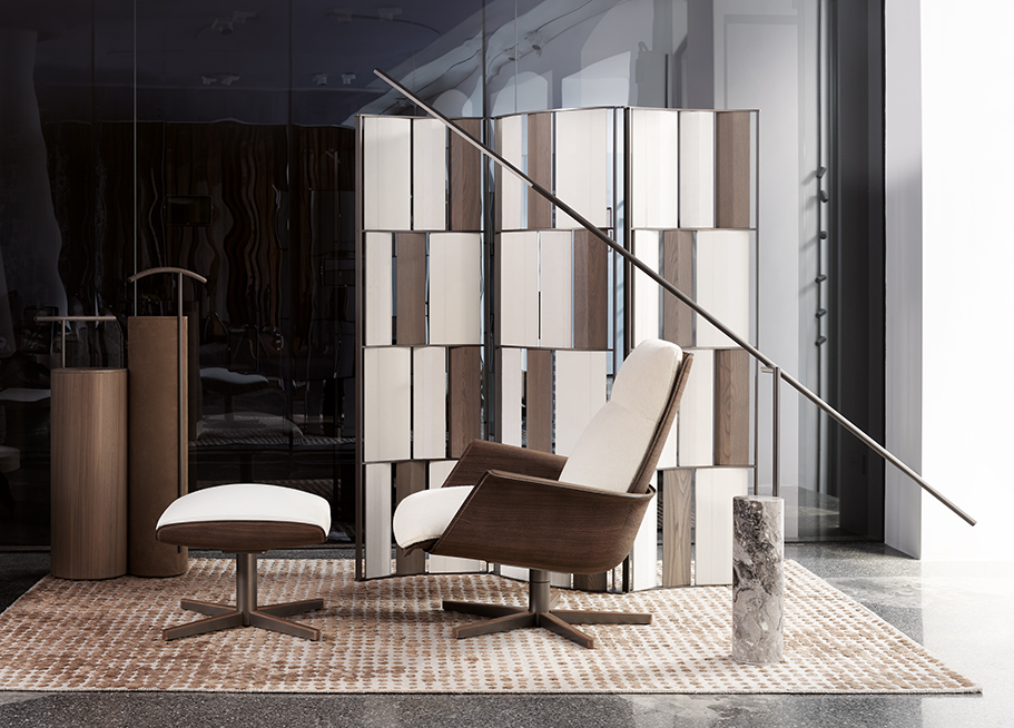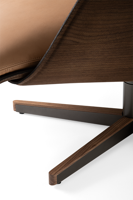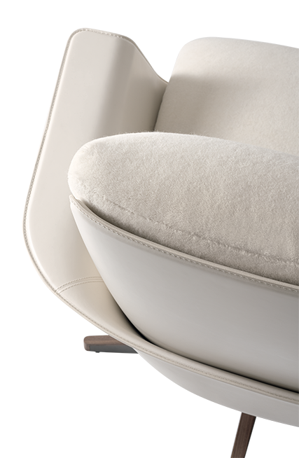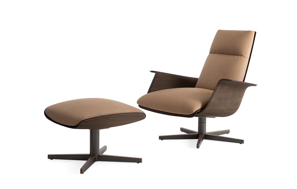 Swivel armchair with ottoman with enveloping shapes for an innovative comfort experience.