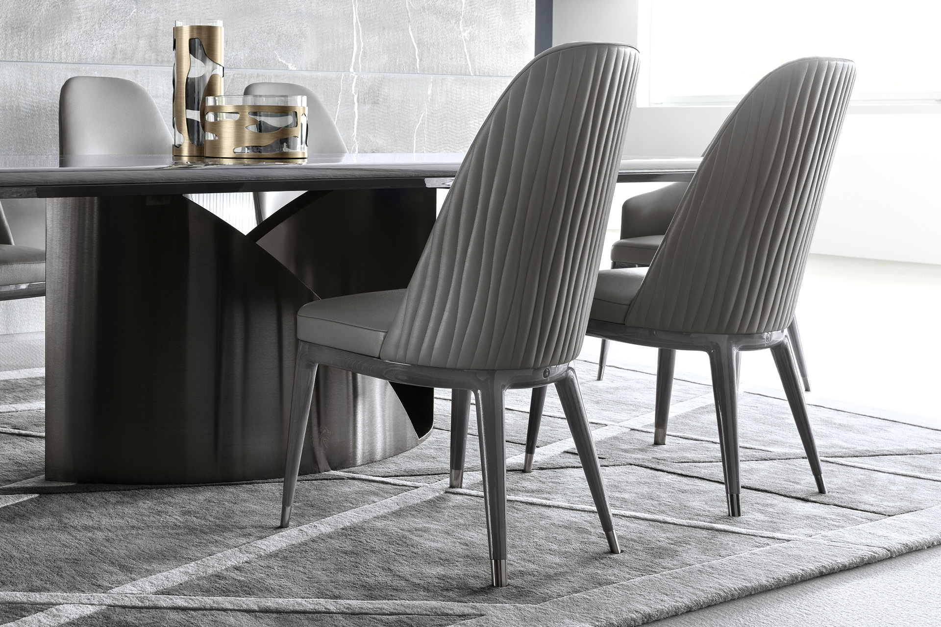 Fully upholstered side chair in solid beech. Back in quilted first grade leather, nubuk leather, lizard printed leather, velvet or suede fabric. Wooden base with Giorgio Collection logo. 4 legs with details in satin black nickel stainless steel.