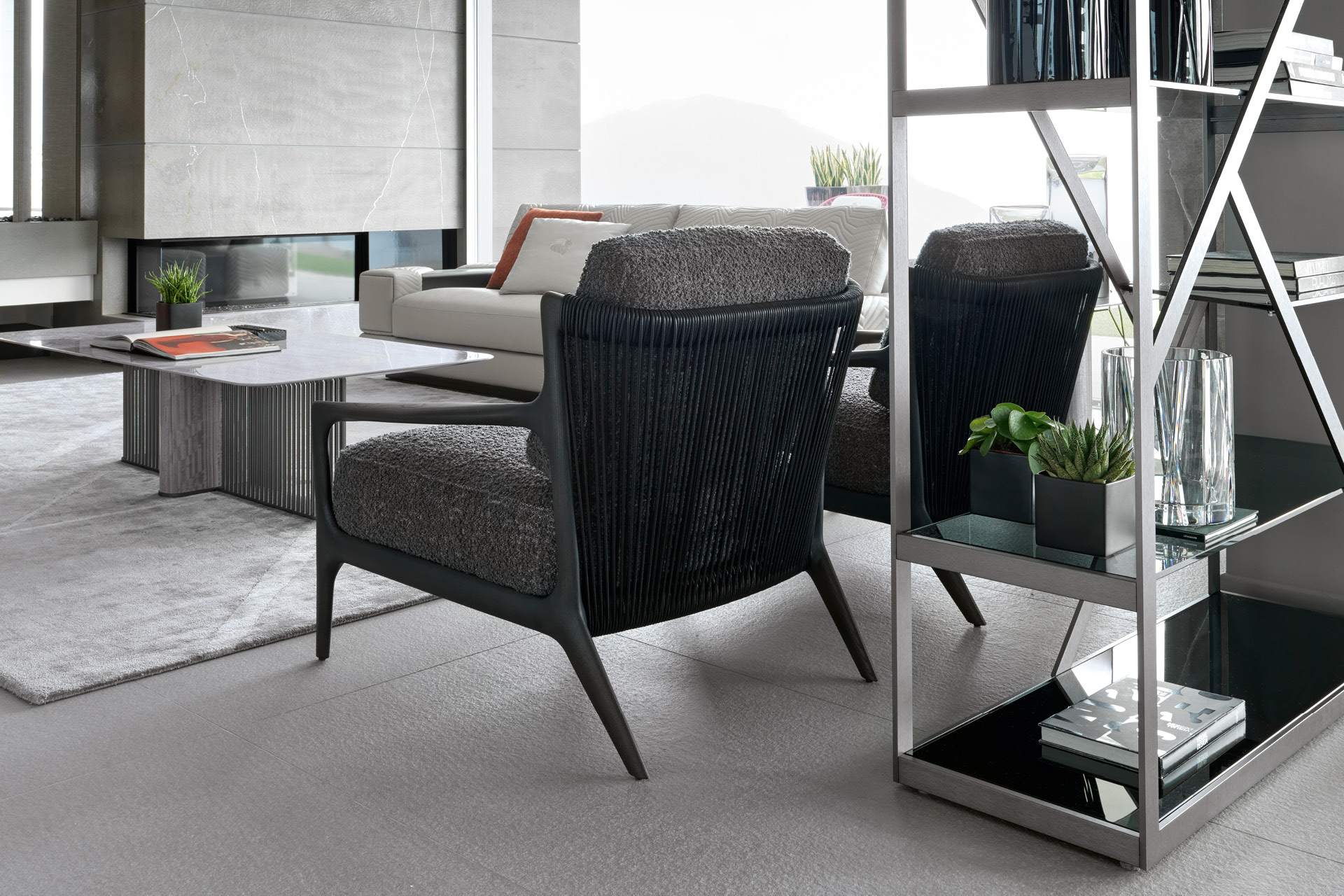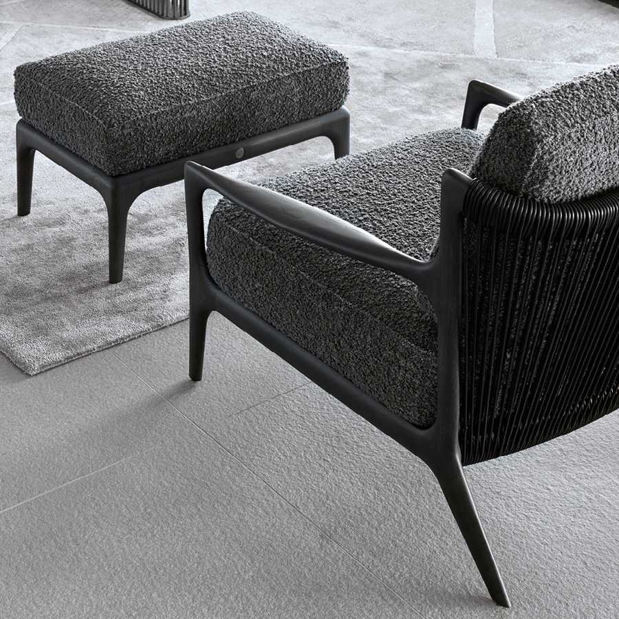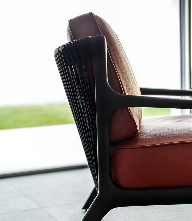 Occasional chair available in first grade leather, nubuk leather, lizard printed leather, velvet or suede fabric. Chair seat and sides with double stitching in polyurethane foam wrapped in down feather. Structure in solid satined black oak. Back in black cordage leather. Wooden base with inserted Giorgio Collection logo.