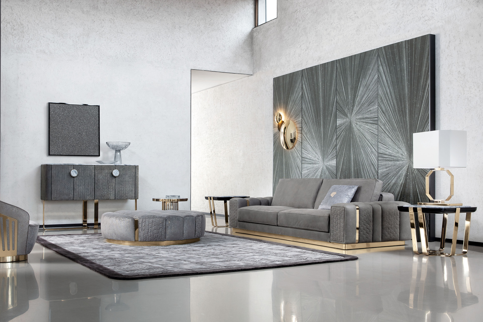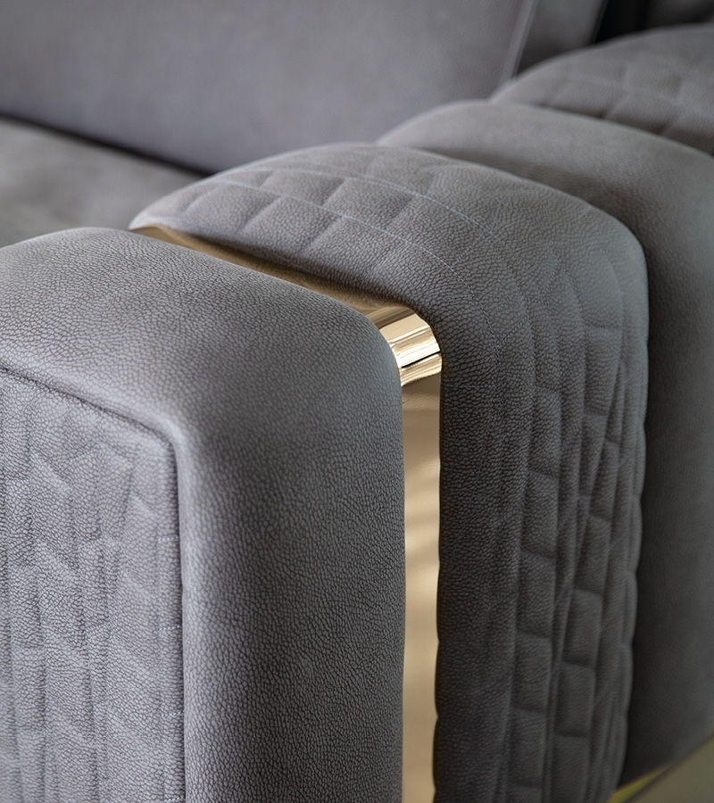Sofa seats and sides with special stitching in polyurethane foam wrapped in down feather. Sofa armrests realized in quilted finish. Base and metal trims on the armrests in light gold chrome stainless steel.