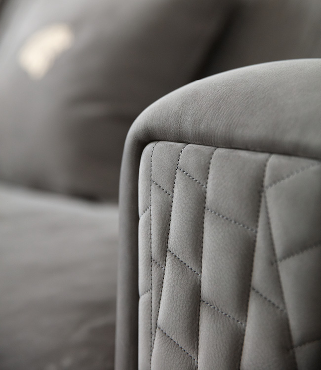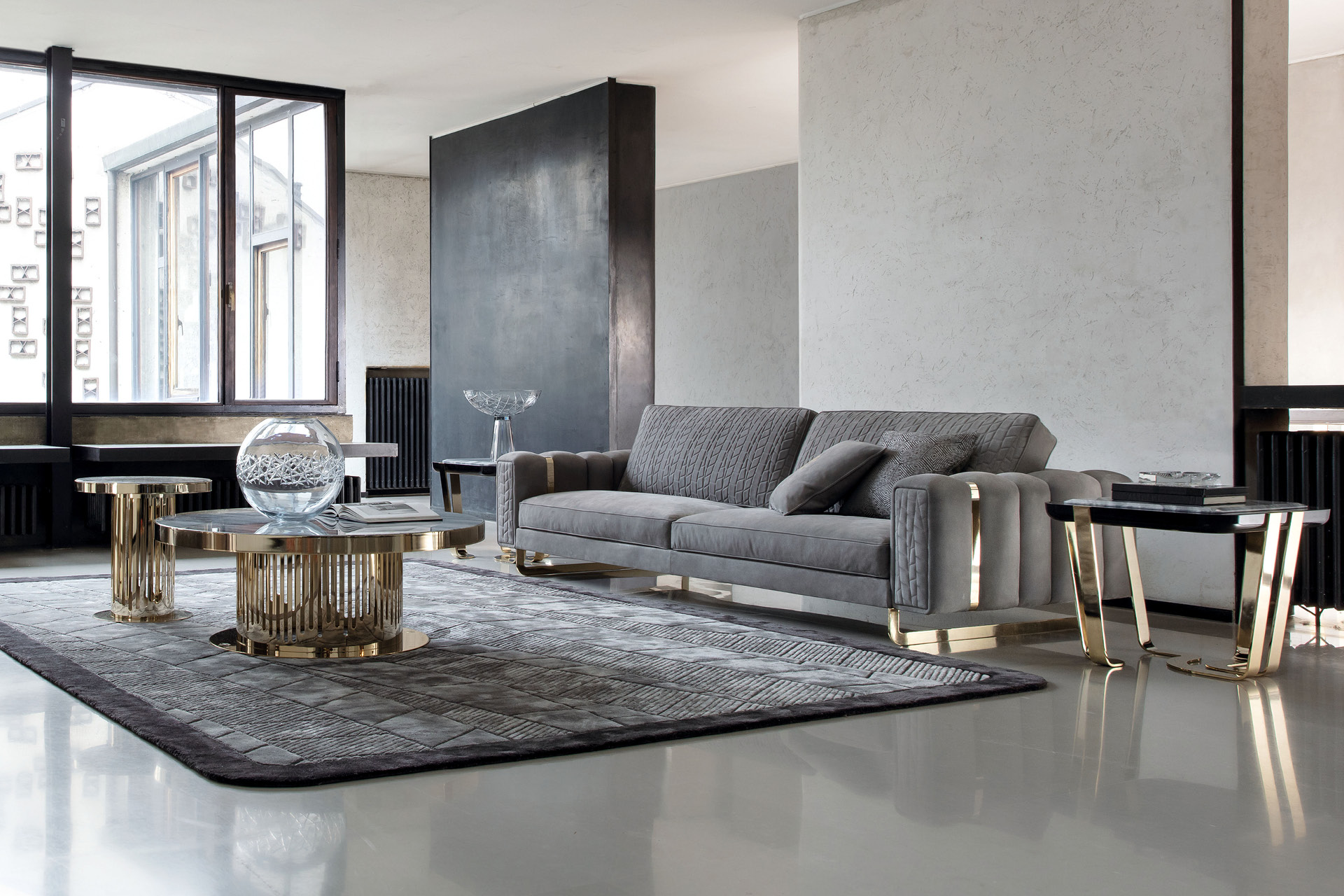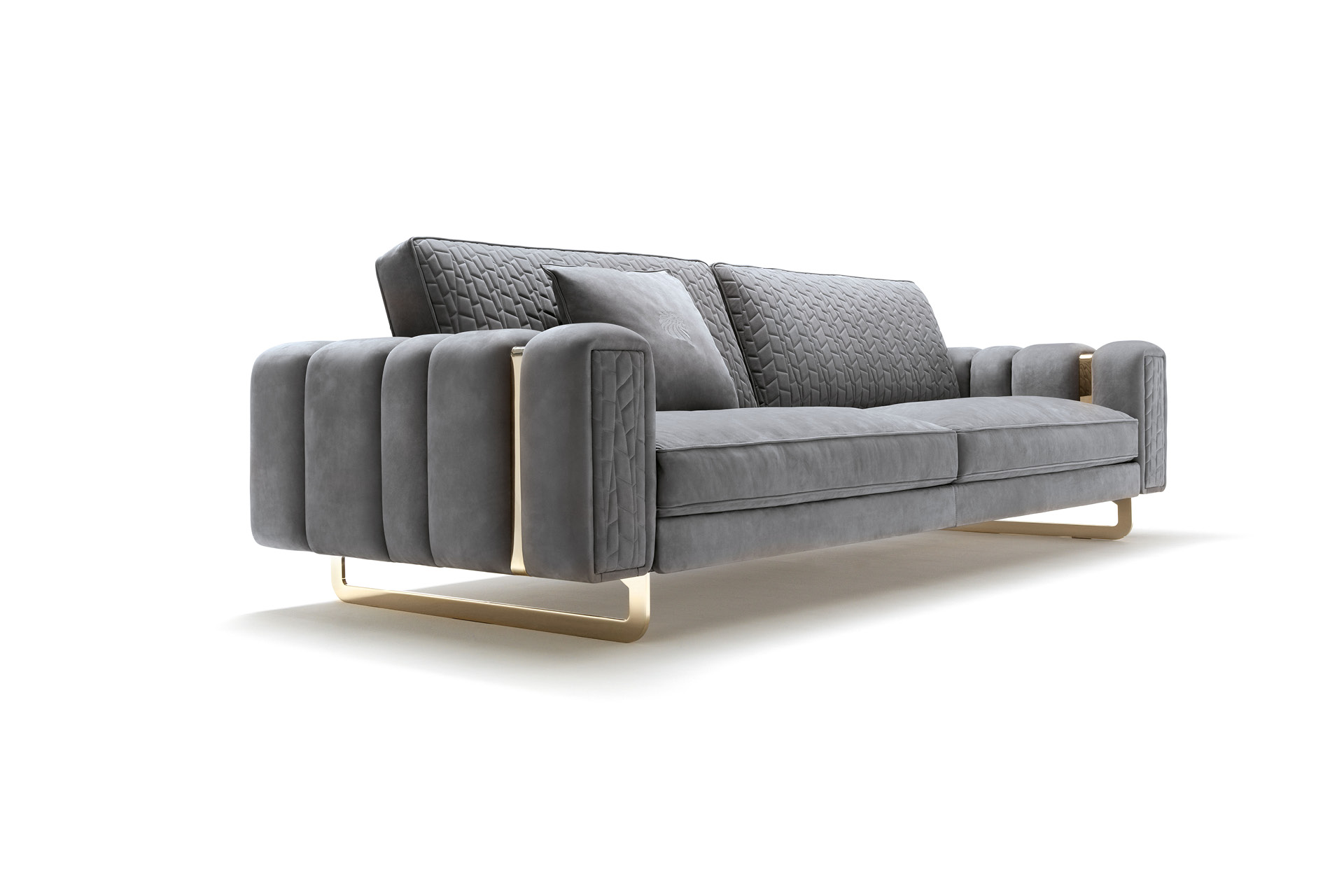 Sofa seats and sides with special stitching in polyurethane foam wrapped in down feather. Sofa armrests realized in quilted finish. Legs and metal trims on the armrests in light gold chrome stainless steel.