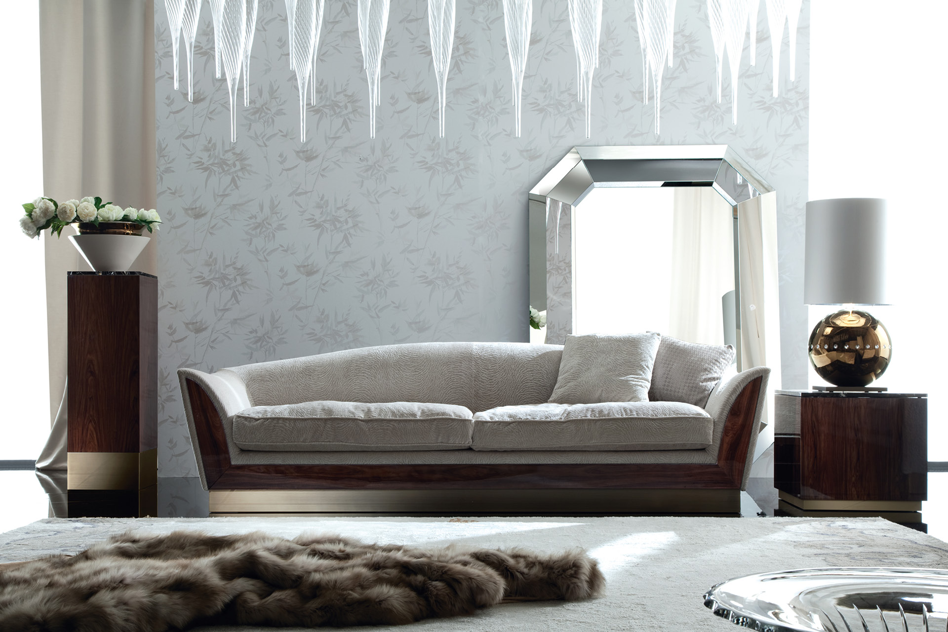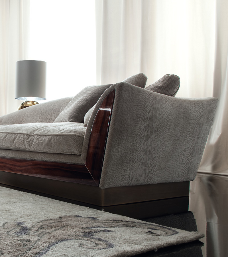 Fixed sofa with front’s inserts in brazilian rosewood veneer with high gloss polyester finish. n. 2 seats.n. 2 pillows. Bronzed stainless steel base.