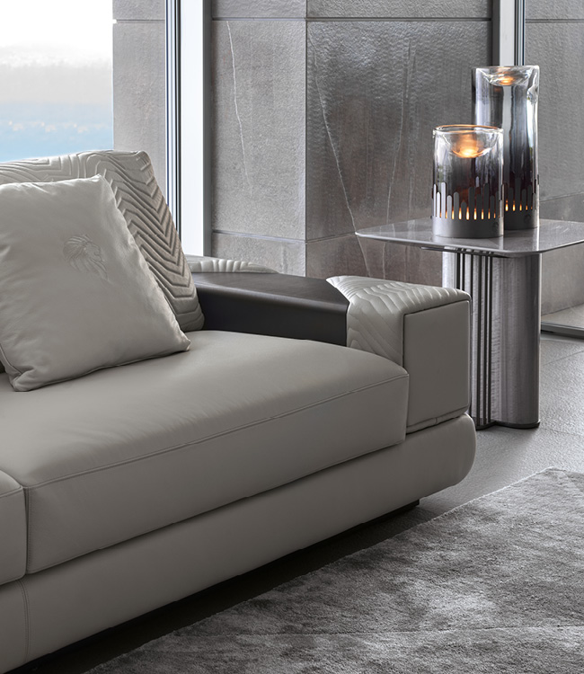 Sofa available in first grade leather, nubuk leather, lizard printed leather, velvet or suede fabric. Sofa seats and sides with special stitching in polyurethane foam wrapped in down feather. Quilted back and armrests. Metal band in the armrests with lasered Giorgio Collection logo. Base and bands in satin grey nickel stainless steel.