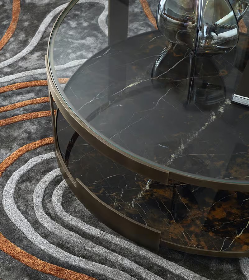 Round cocktail table in bronzed stainless steel. Top in clear 10mm tempered glass. Base in marble with high gloss polyester finish.