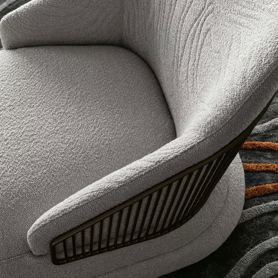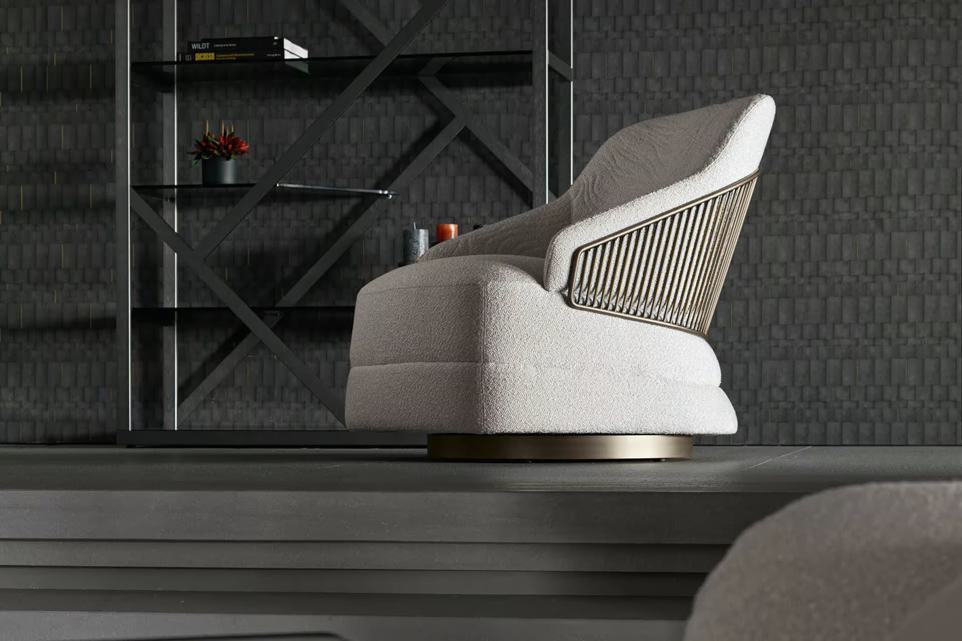 Occasional swivel chair available in first grade leather, nubuk leather, lizard printed leather, velvet or suede fabric. Chair seat and sides with double stitching in polyurethane foam wrapped in down feather. Quilted back with satined bronzed stainless steel structure. Seat height cm. 39.