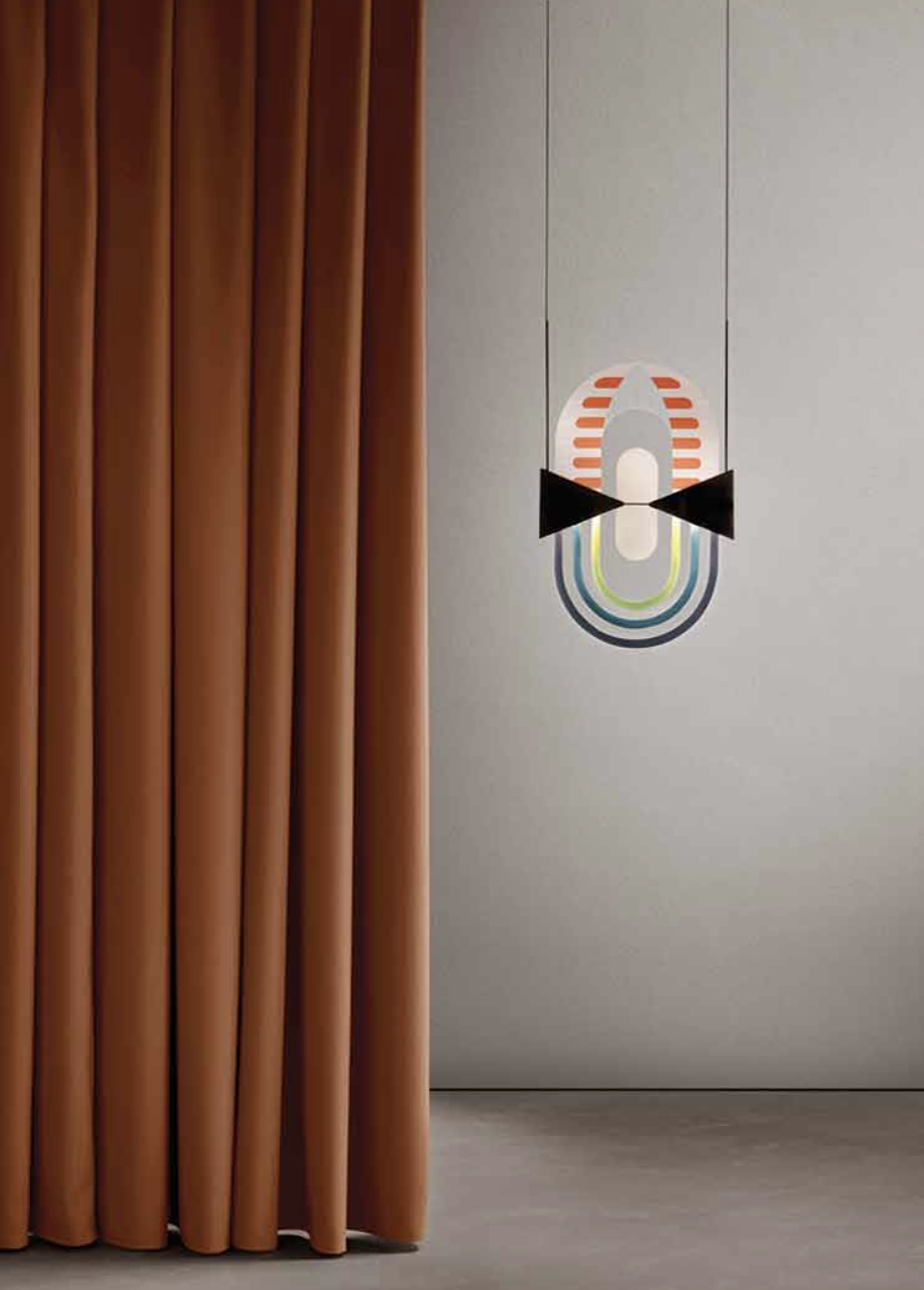 è una lampada a sospensione, sintetica nella sua essenza ma complessa nella sua struttura. La composizione genera inconsapevolmente quell’alito di opulenza caratteristico dell’art déco americana, richiamata anche dal nome della città che incarna quel movimento stilistico. MIAMI è il perfetto connubio tra elementi metallici e vetro decorato, che intrecciandosi fungono da anima e corpo delle lampade stesse, generando un perfetto equilibrio tra estetica e funzione.
