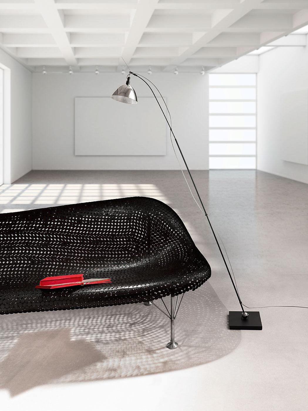 The body of the lamp serves as bookend. The flexible metal arm allows variable adjustment of the lamp head. Anodised aluminium in black or silver, metal.