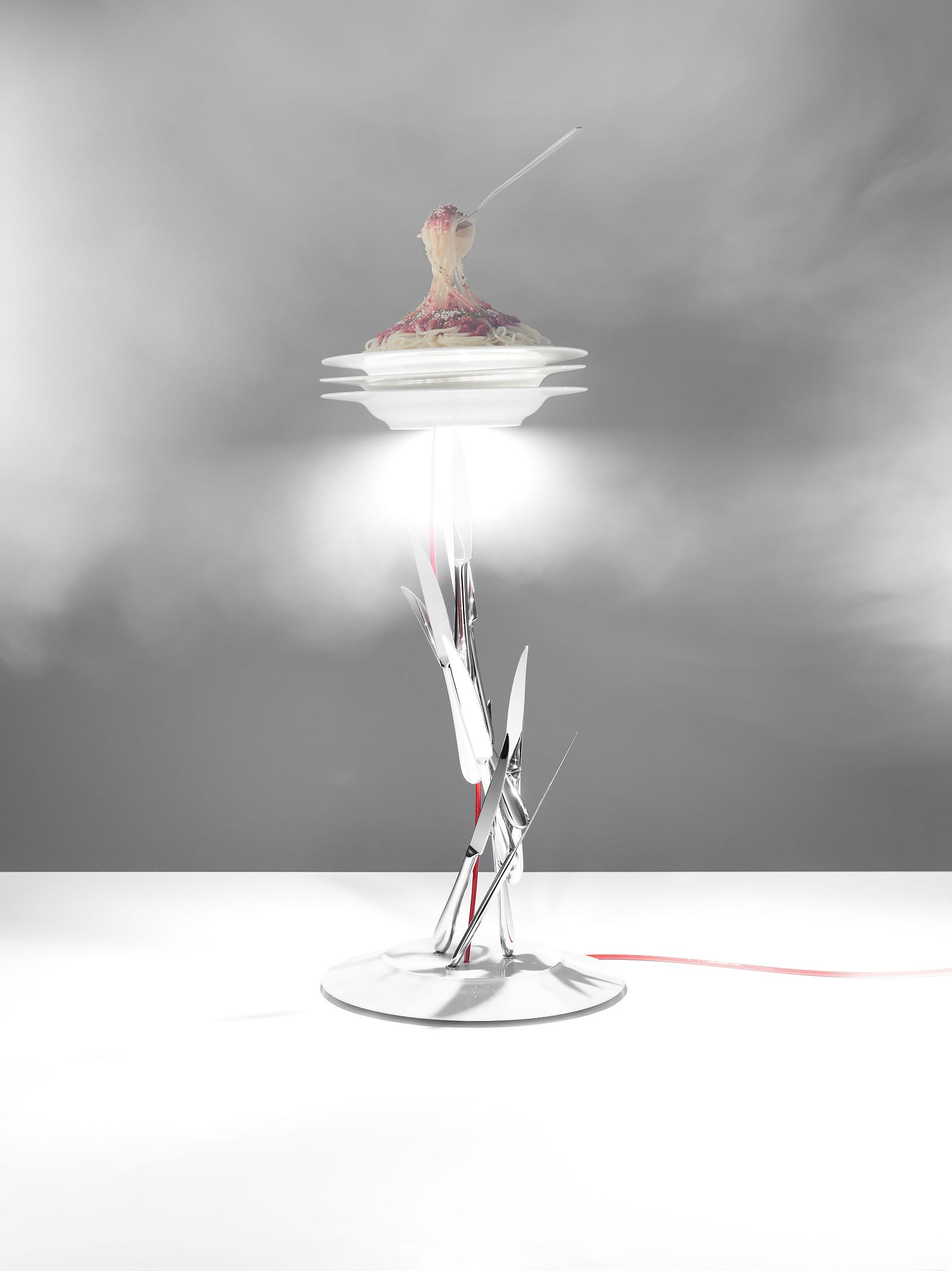 The body of the lamp serves as bookend. The flexible metal arm allows variable adjustment of the lamp head. Anodised aluminium in black or silver, metal.
