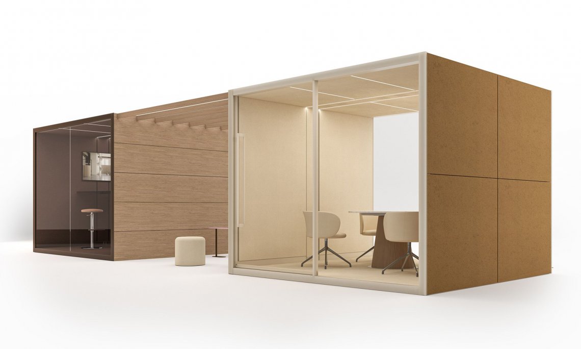 The meeting room version can accommodate tables for meetings or conference calls, monitors and whiteboards.