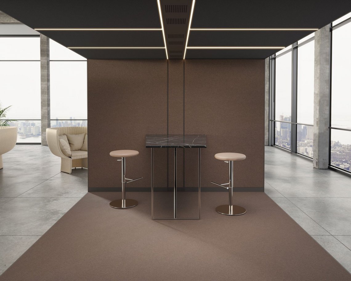 It's available in a wide variety of materials and finishes and can be combined depending on specific needs. The aluminium frames can either be painted or anodised, whilst the walls are available in wood, glass, fabric, melamine or lacquered.