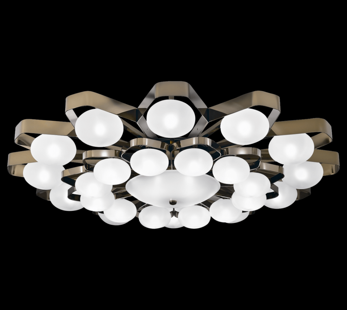 Ceiling lamp in nickel gold metal and blown satin glass diffusers. Available in different dimensions and colours. Incanto Modern Collection.