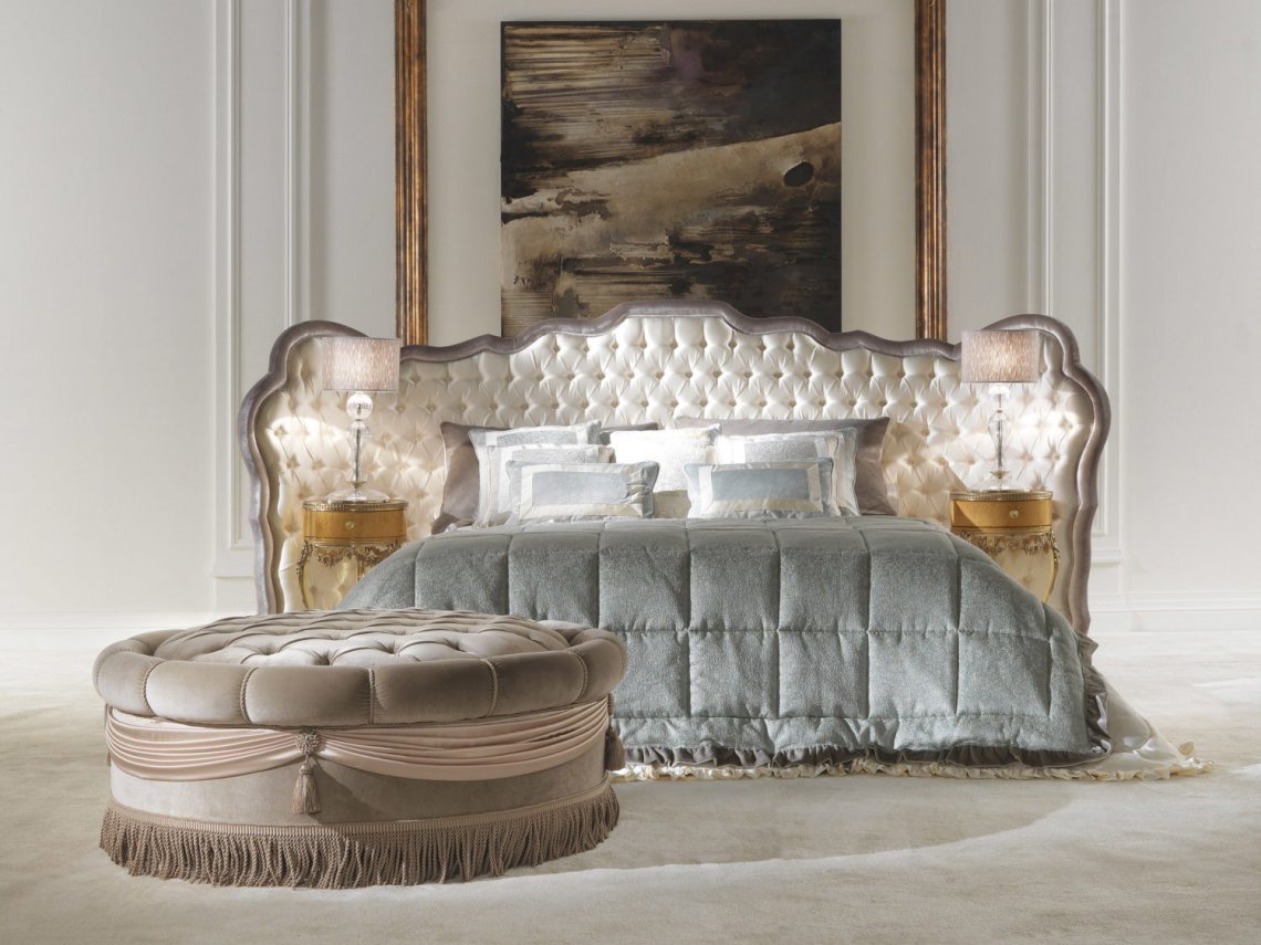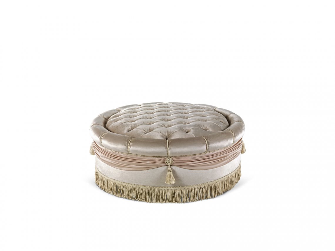 Pouf with structure in beechwood. Padding in foam. Upholstery in fabric with capitonné.