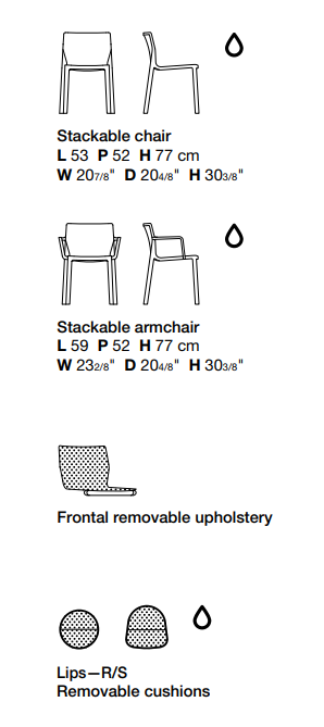 Created by the designer duo LucidiPevere, LP is a versatile minimalist chair. It is made with recycled and recyclable material, available in 6 different colors. LP can be accompanied by removable Lips cushions in two versions or combined with removable seat and backrest upholstery: accessories make it even more comfortable while providing interesting colour contrasts between the fabrics and the chair. Hard-wearing and stackable, LP is ideal for the most varied indoor and outdoor contexts, including the home and community spaces.