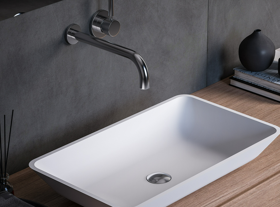 Countertop rectangular washbasin in matt white Solid Surface, with possibility of external Colour finish, glossy or matt.