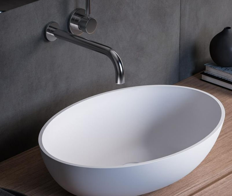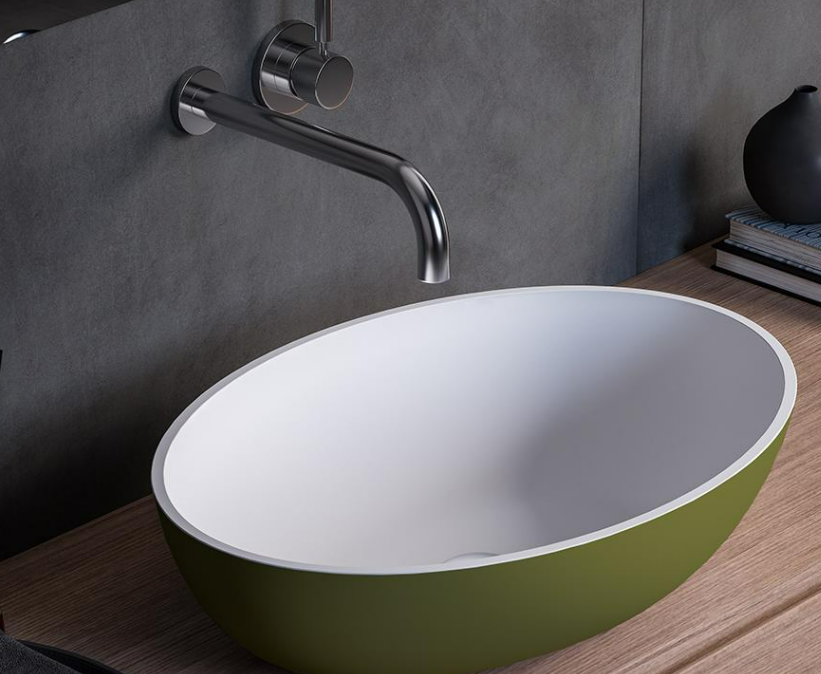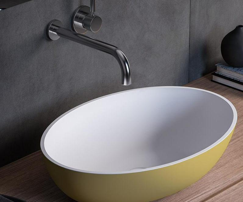 Countertop oval washbasin in matt white Solid Surface, with possibility of external Colour finish, glossy or matt.