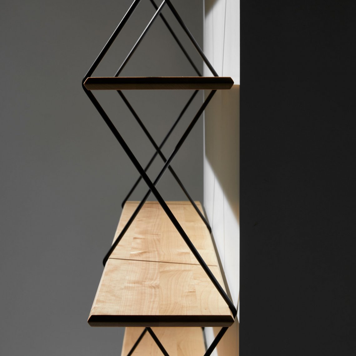 Climb is an ingenious shelving system made of beveled wooden boards supported by metal wires.