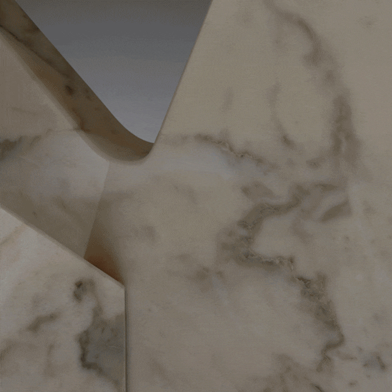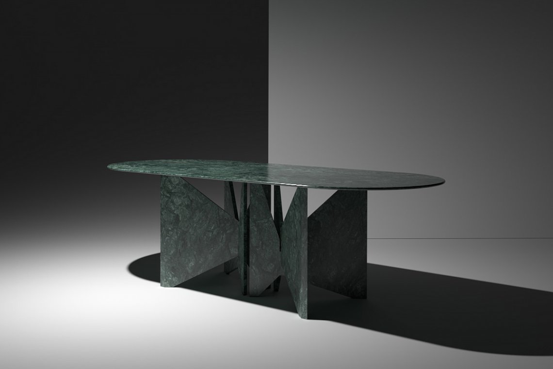 Lamina is a dinner table relying on the intersection of marble slabs. The interlocking triangle shaped legs give it both a sense of equilibrium and dynamism.