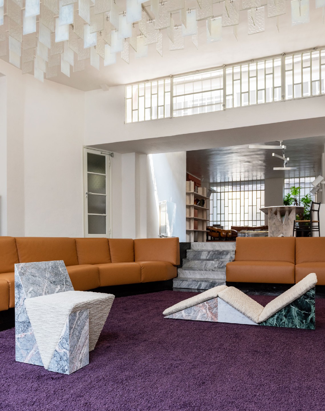 MARMINI II is despite its minimalistic architectural appearance a comfortable upholstered stool. It is composed of three volumes that apparently do not seem to be able to stay together, two hard parts in ‘Fior di Pesco’ marble that seem to want to detach themselves from the central part of the upholstered soft padding.