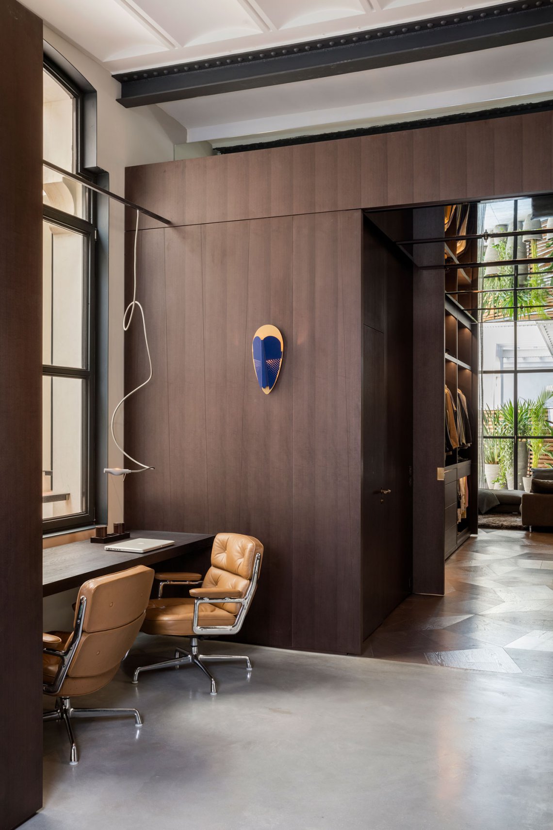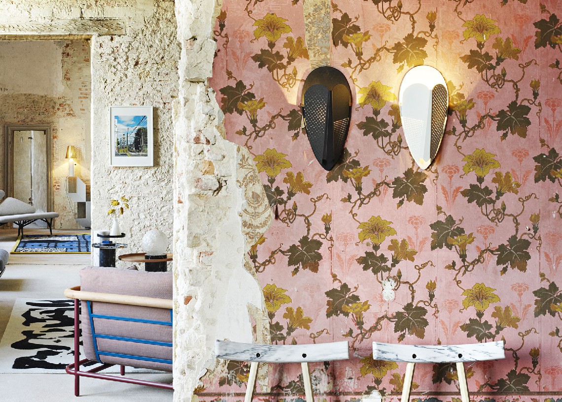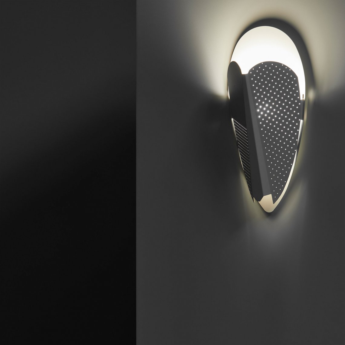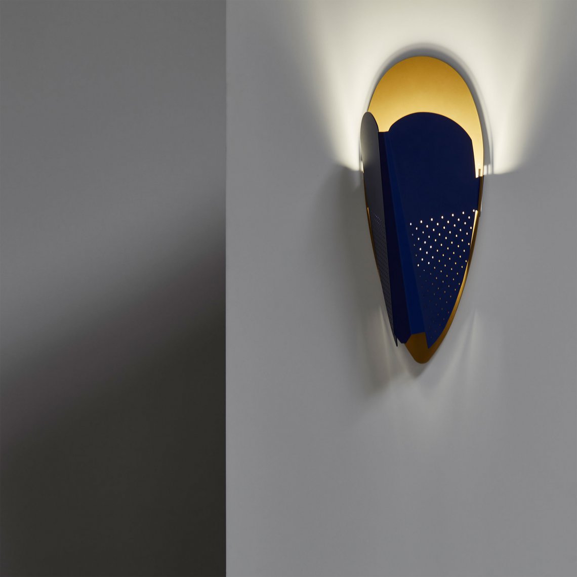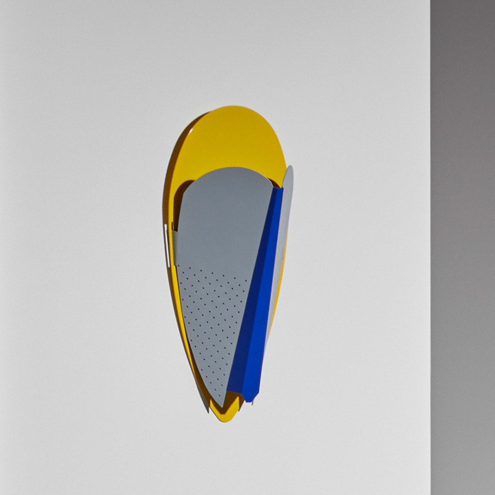 Sorcier is a wall light inspired by the ritual Ngil masks of the Fang tribe in Gabon. The light diffuses through the perforations in the mask and shines upward in a graphic and gentle way. It changes personality depending on the combination of colors, textures and perforated patterns, which vary in each version.